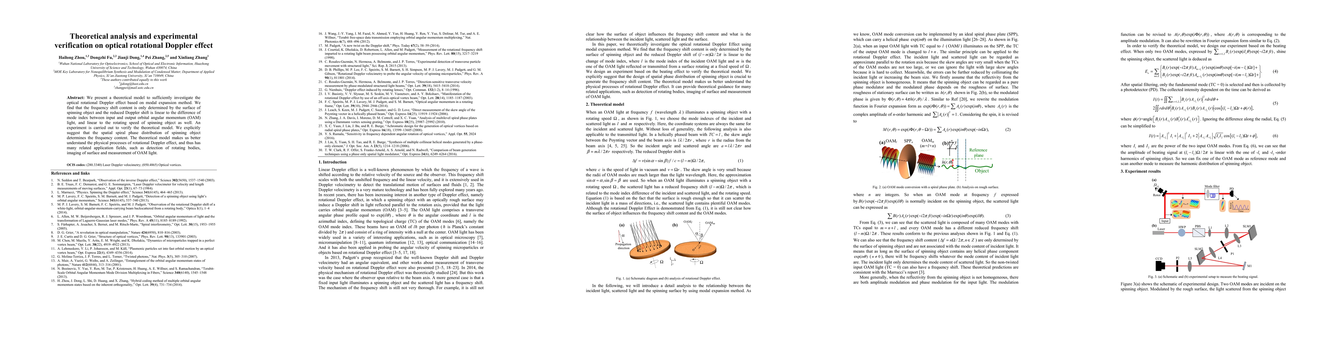 This paper develops a theoretical model to investigate the optical rotational Doppler effect using modal expansion, showing that frequency shifts depend on the spinning object's surface and the difference in orbital angular momentum modes. Experimental verification confirms the model, highlighting the importance of spatial spiral phase distribution, with potential applications in rotating body detection and OAM light measurement.