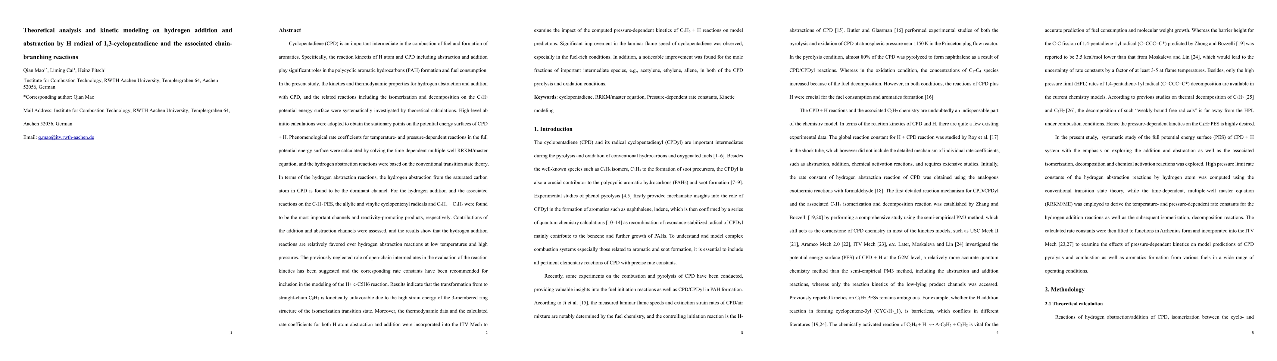 This study uses theoretical calculations to analyze hydrogen addition and abstraction reactions involving 1,3-cyclopentadiene (CPD), an important combustion intermediate. It finds that hydrogen abstraction from saturated carbon in CPD is dominant. The research also identifies key reaction channels like allylic and vinylic cyclopentenyl radicals, and suggests previously neglected open-chain intermediates influence reaction kinetics. Transformation from cyclic to straight-chain C5H7 is deemed kinetically unfavorable due to strain energy. The computed rate coefficients are used to examine model predictions for C5H6 + H reactions.
