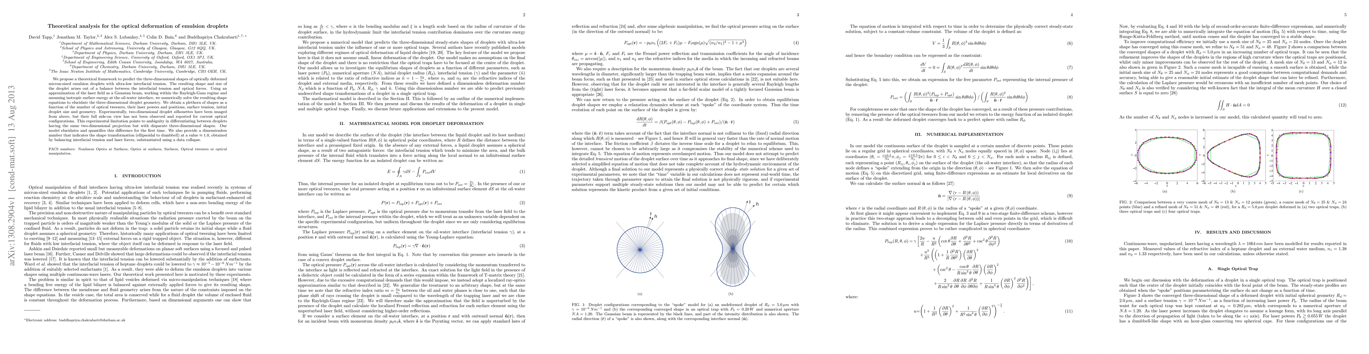 We propose a theoretical framework to predict the three-dimensional shapes of optically deformed micron-sized emulsion droplets with ultra-low interfacial tension. The resulting shape and size of the droplet arises out of a balance between the interfacial tension and optical forces. Using an approximation of the laser field as a Gaussian beam, working within the Rayleigh-Gans regime and assuming isotropic surface energy at the oil-water interface, we numerically solve the resulting shape equations to elucidate the three-dimensional droplet geometry. We obtain a plethora of shapes as a function of the number of optical tweezers, their laser powers and positions, surface tension, initial droplet size and geometry. Experimentally, two-dimensional droplet silhouettes have been imaged from above, but their full side-on view has not been observed and reported for current optical configurations. This experimental limitation points to ambiguity in differentiating between droplets having the same two-dimensional projection but with disparate three-dimensional shapes. Our model elucidates and quantifies this difference for the first time. We also provide a dimensionless number that indicates the shape transformation (ellipsoidal to dumbbell) at a value $\approx 1.0$, obtained by balancing interfacial tension and laser forces, substantiated using a data collapse.