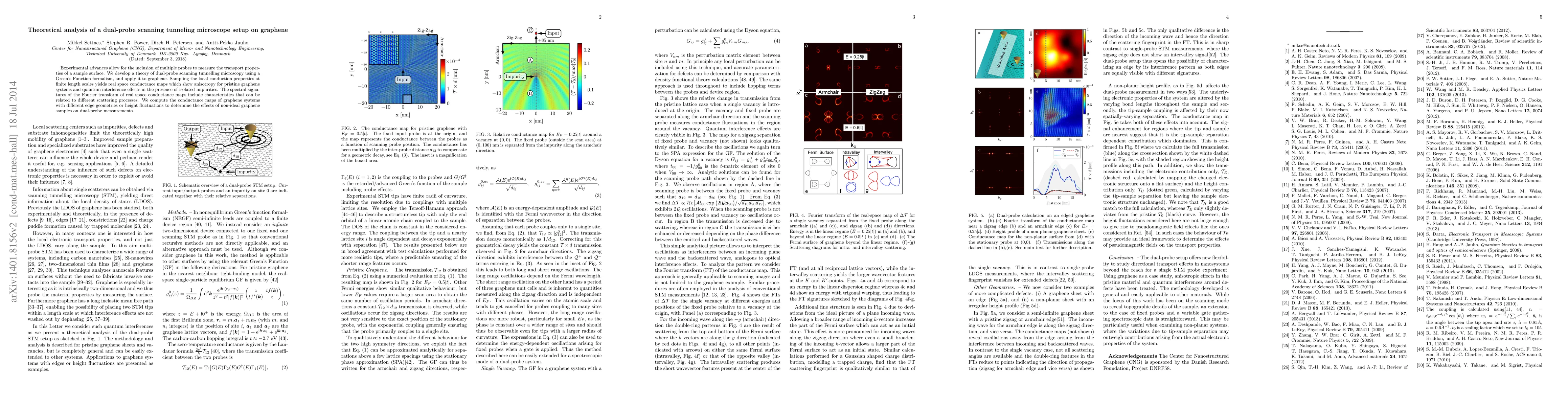 Experimental advances allow for the inclusion of multiple probes to measure the transport properties of a sample surface. We develop a theory of dual-probe scanning tunnelling microscopy using a Green's Function formalism, and apply it to graphene. Sampling the local conduction properties at finite length scales yields real space conductance maps which show anisotropy for pristine graphene systems and quantum interference effects in the presence of isolated impurities. The spectral signatures of the Fourier transform of real space conductance maps include characteristics that can be related to different scattering processes. We compute the conductance maps of graphene systems with different edge geometries or height fluctuations to determine the effects of non-ideal graphene samples on dual-probe measurements.