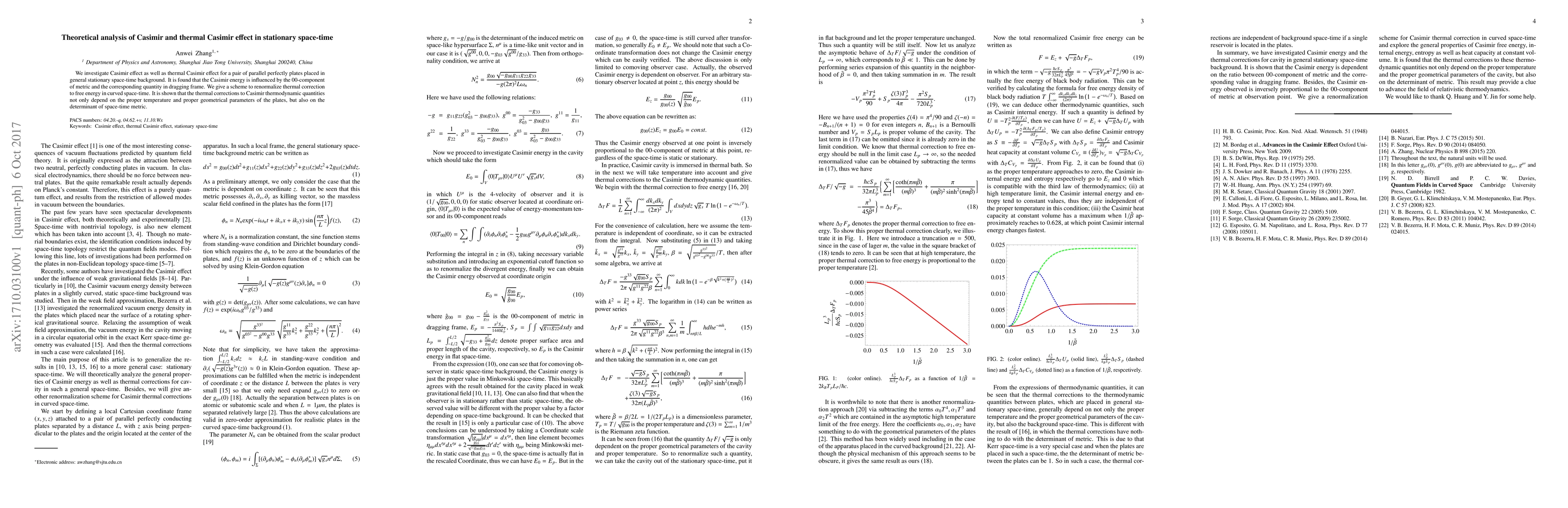 This paper analyzes the Casimir and thermal Casimir effects for parallel plates in stationary space-time, revealing that the Casimir energy is affected by the 00-component of the metric and its dragging frame counterpart. The study also proposes a renormalization scheme for thermal corrections in curved space-time, showing that these corrections depend on proper temperature, geometrical parameters, and the space-time metric determinant.
