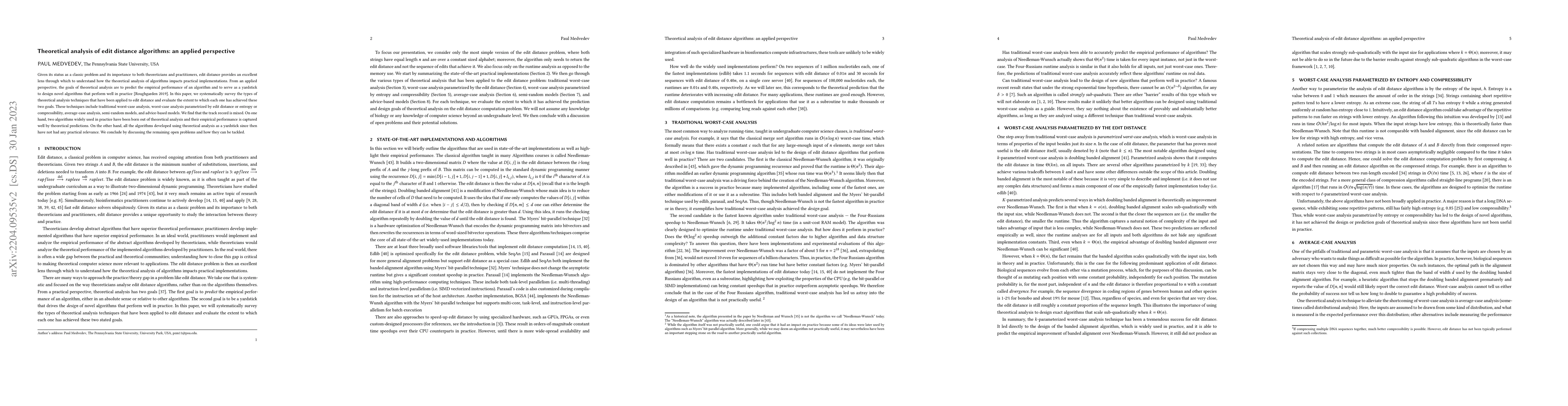 This paper surveys various theoretical analysis techniques applied to edit distance algorithms, finding mixed results in predicting practical performance. While some theoretical analyses have successfully predicted the empirical performance of widely used algorithms, others have failed to produce practically relevant outcomes.