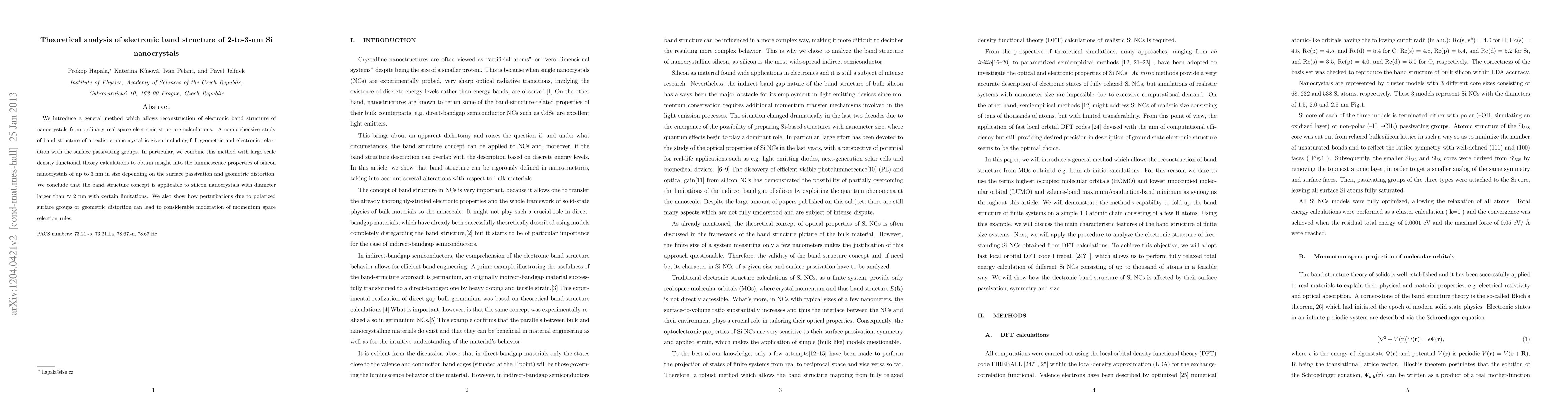 This paper presents a method to reconstruct the electronic band structure of 2-to-3 nm Si nanocrystals using density functional theory, revealing insights into their luminescence properties influenced by surface passivation and geometric distortions. The study concludes that the band structure concept is applicable to larger nanocrystals but with limitations due to surface effects.