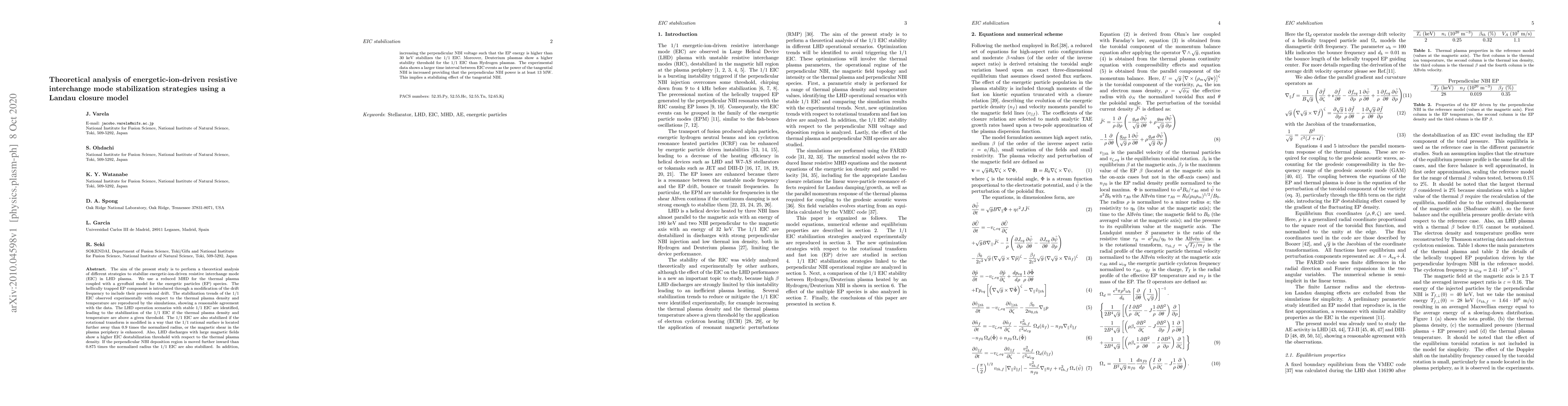 The aim of the present study is to perform a theoretical analysis of different strategies to stabilize energetic-ion-driven resistive interchange mode (EIC) in LHD plasma. We use a reduced MHD for the thermal plasma coupled with a gyrofluid model for the energetic particles (EP) species. The hellically trapped EP component is introduced through a modification of the drift frequency to include their precessional drift. The stabilization trends of the 1/1 EIC observed experimentally with respect to the thermal plasma density and temperature are reproduced by the simulations, showing a reasonable agreement with the data. The LHD operation scenarios with stable 1/1 EIC are identified, leading to the stabilization of the 1/1 EIC if the thermal plasma density and temperature are above a given threshold. The 1/1 EIC are also stabilized if the rotational transform is modified in a way that the 1/1 rational surface is located further away than 0.9 times the normalized radius, or the magnetic shear in the plasma periphery is enhanced. Also, LHD discharges with large magnetic fields show a higher EIC destabilization threshold with respect to the thermal plasma density. If the perpendicular NBI deposition region is moved further inward than 0.875 times the normalized radius the 1/1 EIC are also stabilized. In addition, increasing the perpendicular NBI voltage such that the EP energy is higher than 30 keV stabilizes the 1/1 EIC. Moreover, Deuterium plasmas show a higher stability threshold for the 1/1 EIC than Hydrogen plasmas. The experimental data shows a larger time interval between EIC events as the power of the tangential NBI is increased providing that the perpendicular NBI power is at least 13 MW. This implies a stabilizing effect of the tangential NBI.