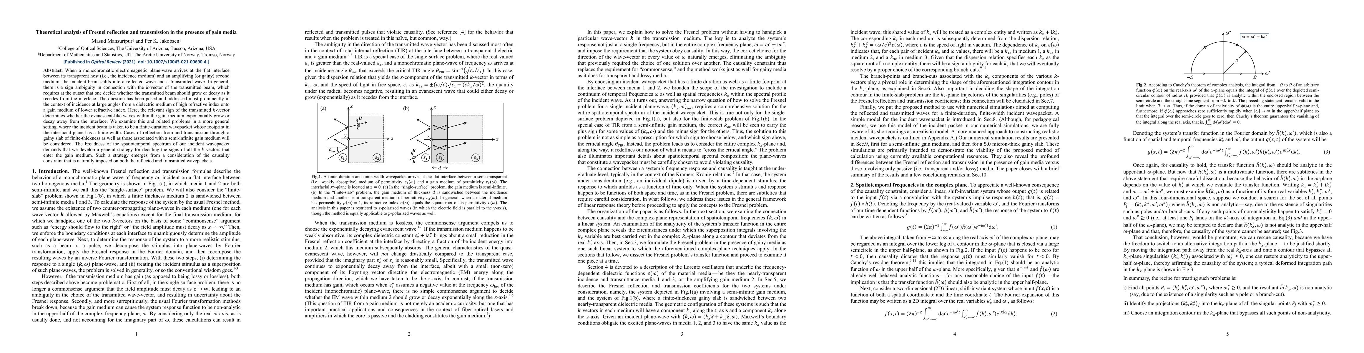 When a monochromatic electromagnetic plane-wave arrives at the flat interface between its transparent host (i.e., the incidence medium) and an amplifying (or gainy) second medium, the incident beam splits into a reflected wave and a transmitted wave. In general, there is a sign ambiguity in connection with the k-vector of the transmitted beam, which requires at the outset that one decide whether the transmitted beam should grow or decay as it recedes from the interface. The question has been posed and addressed most prominently in the context of incidence at large angles from a dielectric medium of high refractive index onto a gain medium of lower refractive index. Here, the relevant sign of the transmitted k-vector determines whether the evanescent-like waves within the gain medium exponentially grow or decay away from the interface. We examine this and related problems in a more general setting, where the incident beam is taken to be a finite-duration wavepacket whose footprint in the interfacial plane has a finite width. Cases of reflection from and transmission through a gainy slab of finite-thickness as well as those associated with a semi-infinite gain medium will be considered. The broadness of the spatiotemporal spectrum of our incident wavepacket demands that we develop a general strategy for deciding the signs of all the k-vectors that enter the gain medium. Such a strategy emerges from a consideration of the causality constraint that is naturally imposed on both the reflected and transmitted wavepackets.