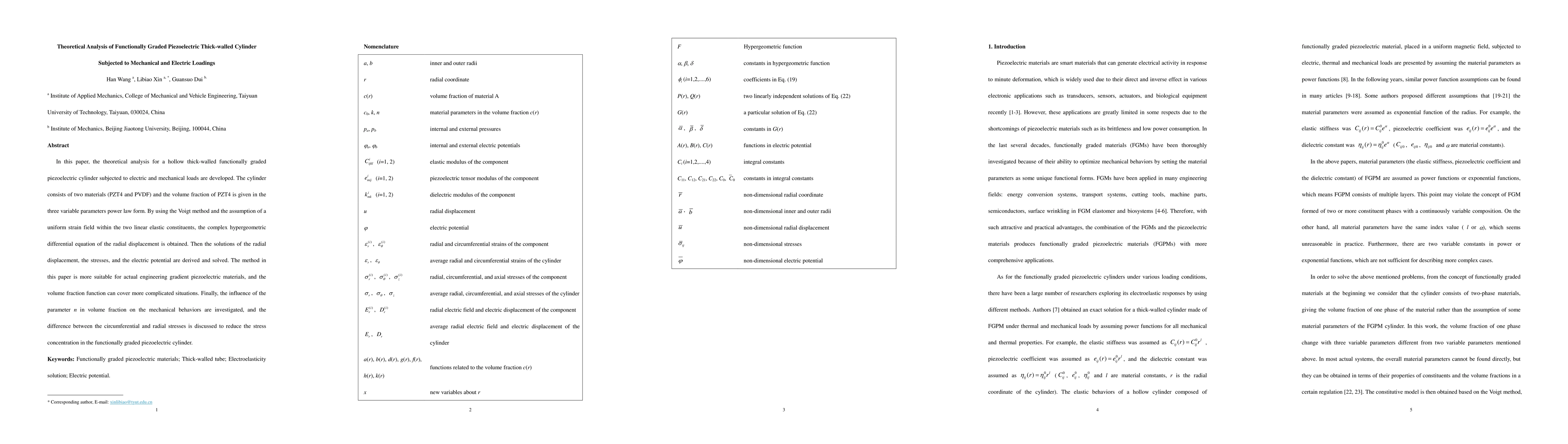 This paper develops a theoretical analysis for a functionally graded piezoelectric thick-walled cylinder under electric and mechanical loads, using PZT4 and PVDF materials with a volume fraction defined by a power law. Solutions for radial displacement, stresses, and electric potential are derived to evaluate mechanical behaviors and stress concentration reduction.