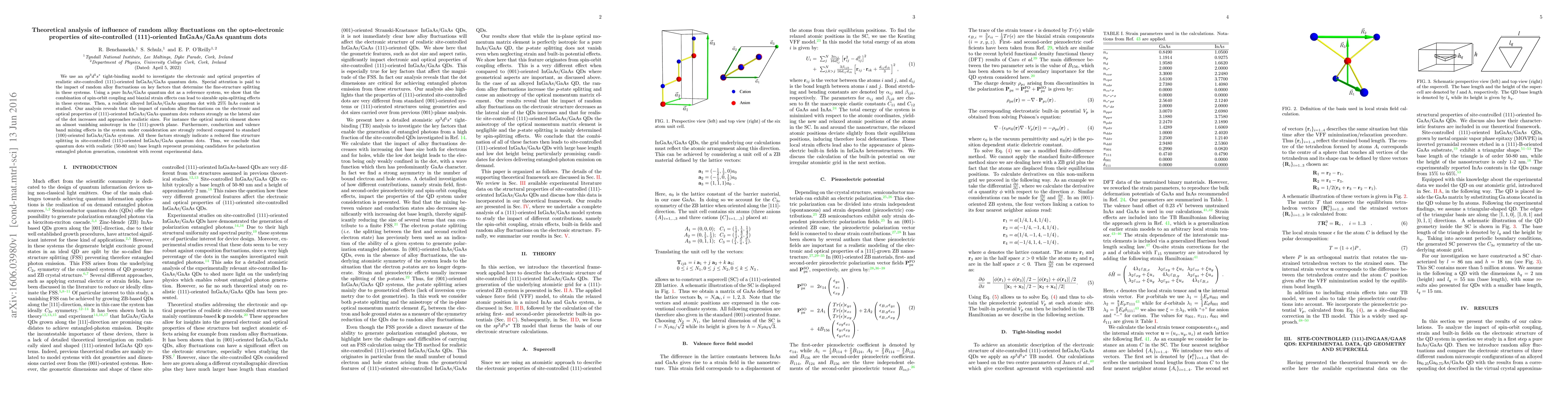 This paper investigates the opto-electronic properties of site-controlled (111)-oriented InGaAs/GaAs quantum dots using a tight-binding model, focusing on the effects of random alloy fluctuations. It finds that these fluctuations have a reduced impact on larger quantum dots, leading to a diminished fine-structure splitting and promising potential for polarization entangled photon generation.