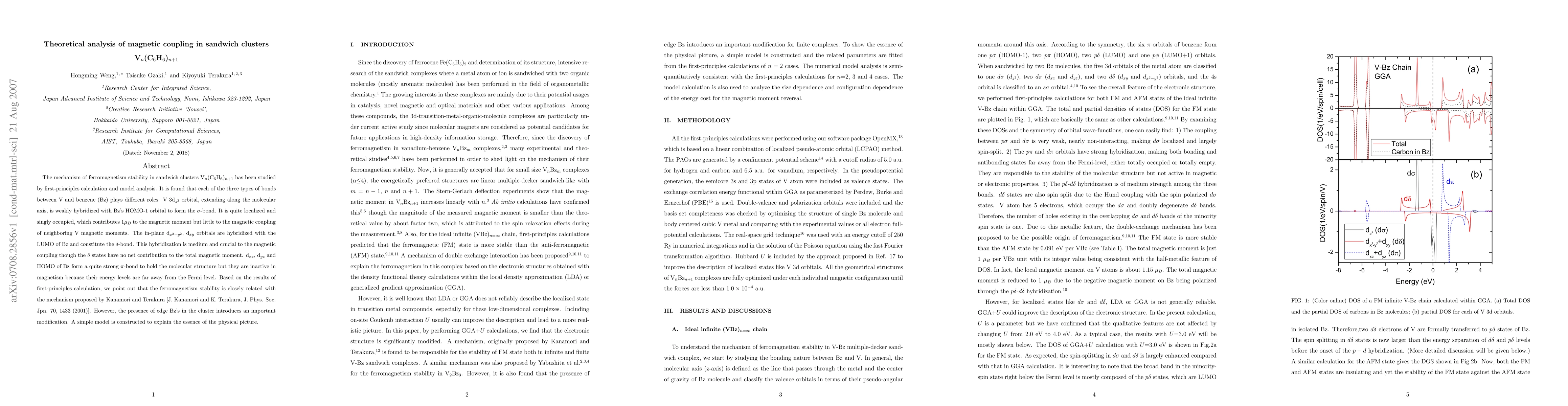 The mechanism of ferromagnetism stability in sandwich clusters V$_n$(C$_6$H$_6$)$_{n+1}$ has been studied by first-principles calculation and model analysis. It is found that each of the three types of bonds between V and benzene (Bz) plays different roles. V 3d$_{z^2}$ orbital, extending along the molecular axis, is weakly hybridized with Bz's HOMO-1 orbital to form the $\sigma$-bond. It is quite localized and singly occupied, which contributes 1$\mu_B$ to the magnetic moment but little to the magnetic coupling of neighboring V magnetic moments. The in-plane d$_{x^2-y^2}$, d$_{xy}$ orbitals are hybridized with the LUMO of Bz and constitute the $\delta$-bond. This hybridization is medium and crucial to the magnetic coupling though the $\delta$ states have no net contribution to the total magnetic moment. d$_{xz}$, d$_{yz}$ and HOMO of Bz form a quite strong $\pi$-bond to hold the molecular structure but they are inactive in magnetism because their energy levels are far away from the Fermi level. Based on the results of first-principles calculation, we point out that the ferromagnetism stability is closely related with the mechanism proposed by Kanamori and Terakura [J. Kanamori and K. Terakura, J. Phys. Soc. Jpn. 70, 1433 (2001)]. However, the presence of edge Bz's in the cluster introduces an important modification. A simple model is constructed to explain the essence of the physical picture.
