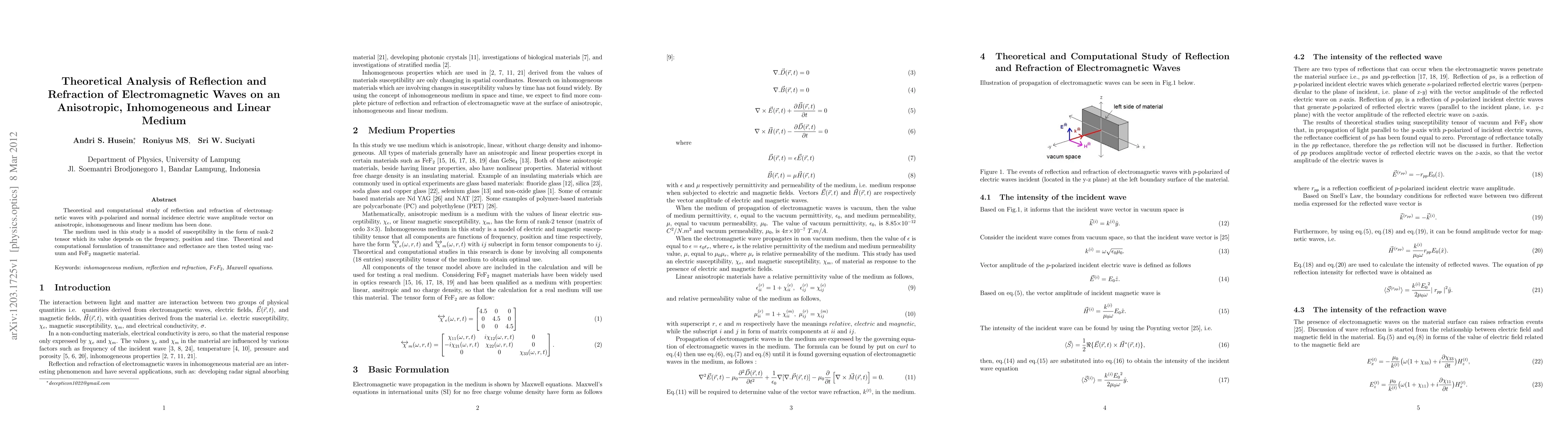 Theoretical and computational study of reflection and refraction of electromagnetic waves with $p$-polarized and normal incidence electric wave amplitude vector on anisotropic, inhomogeneous and linear medium has been done. The medium used in this study is a model of susceptibility in the form of rank-2 tensor which its value depends on the frequency, position and time. Theoretical and computational formulation of transmittance and reflectance are then tested using vacuum and FeF$_2$ magnetic material.