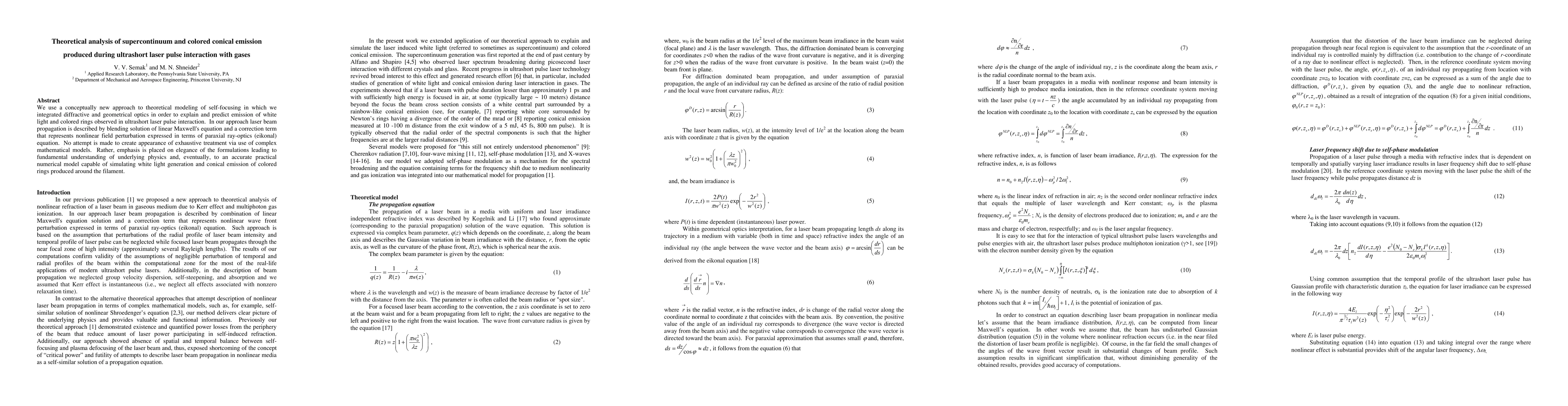 We use a conceptually new approach to theoretical modeling of self-focusing in which we integrated diffractive and geometrical optics in order to explain and predict emission of white light and colored rings observed in ultrashort laser pulse interaction. In our approach laser beam propagation is described by blending solution of linear Maxwell's equation and a correction term that represents nonlinear field perturbation expressed in terms of paraxial ray-optics (eikonal) equation. No attempt is made to create appearance of exhaustive treatment via use of complex mathematical models. Rather, emphasis is placed on elegance of the formulations leading to fundamental understanding of underlying physics and, eventually, to an accurate practical numerical model capable of simulating white light generation and conical emission of colored rings produced around the filament.