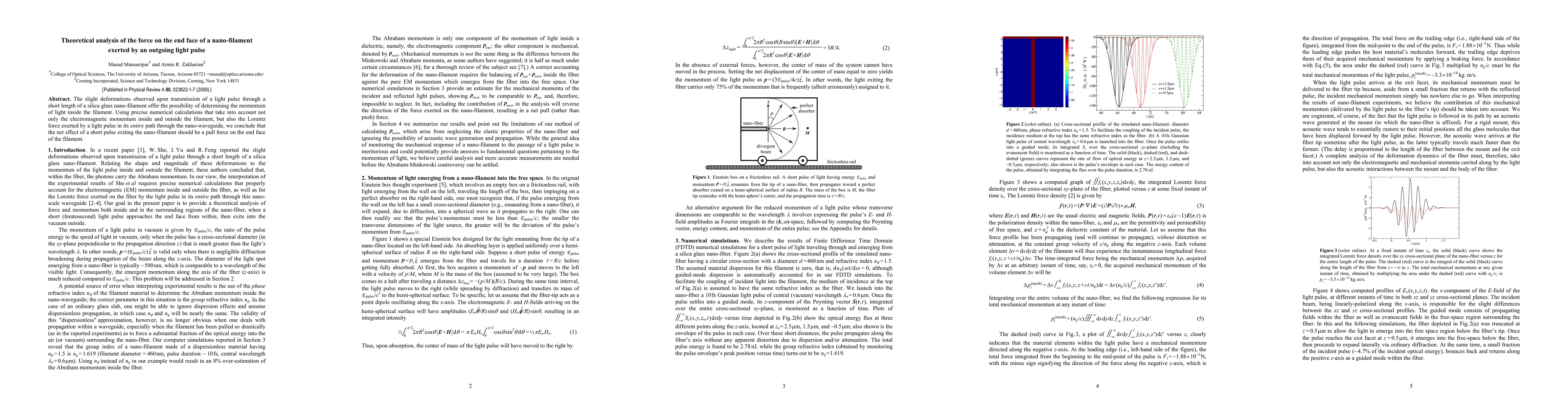 The slight deformations observed upon transmission of a light pulse through a short length of a silica glass nano-filament offer the possibility of determining the momentum of light inside the filament. Using precise numerical calculations that take into account not only the electromagnetic momentum inside and outside the filament, but also the Lorentz force exerted by a light pulse in its entire path through the nano-waveguide, we conclude that the net effect of a short pulse exiting the nano-filament should be a pull force on the end face of the filament.