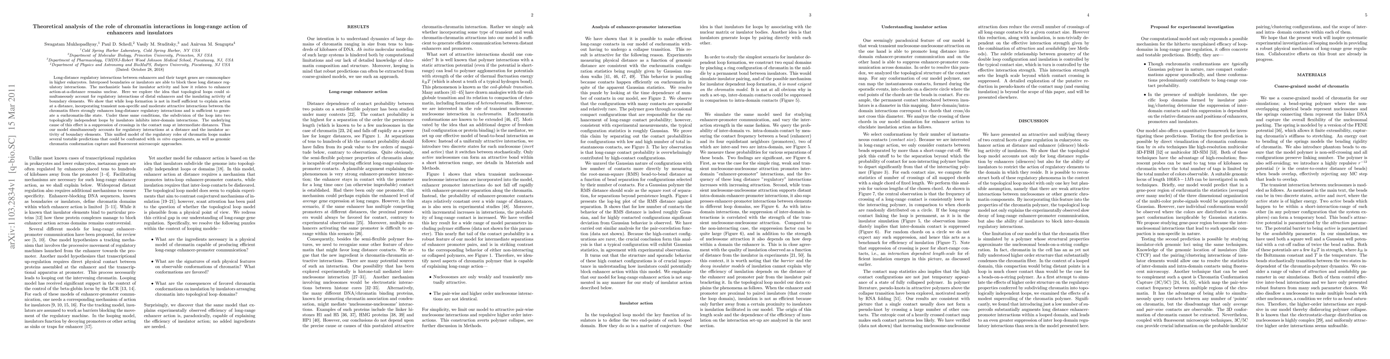 This paper proposes a theoretical model explaining how chromatin loops facilitate long-range enhancer-gene interactions while insulators block these interactions, suggesting that transient interactions between chromatin fibers enhance regulatory distances and that insulators inhibit interactions by suppressing intermediate distances' crossings in the contact map. The model provides testable predictions for experimental validation.
