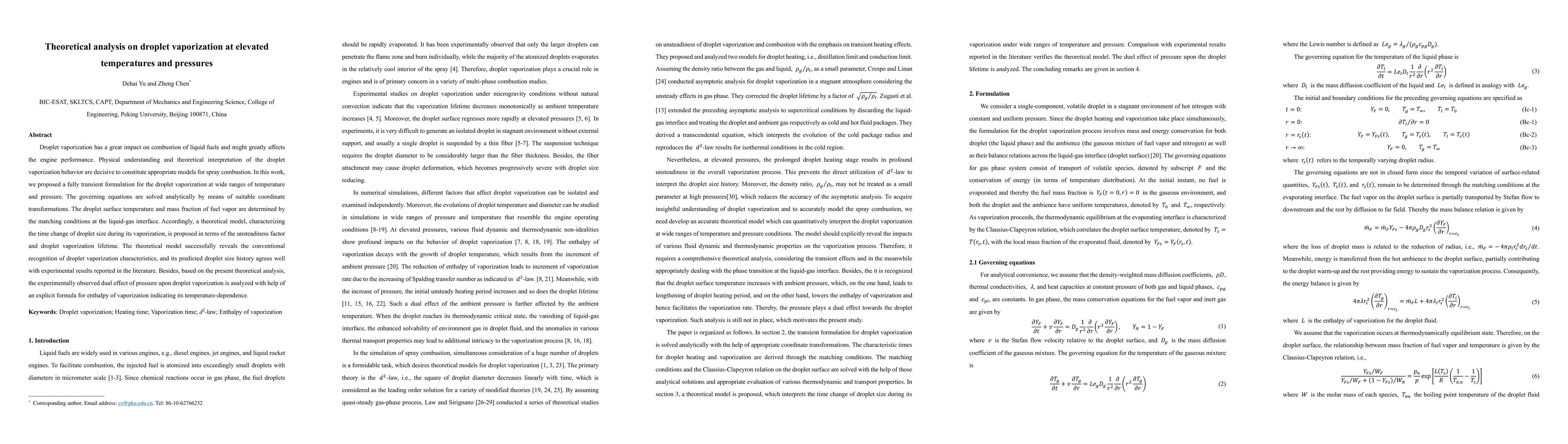 This paper proposes a theoretical model for droplet vaporization under varying temperature and pressure conditions, analyzing the transient behavior and deriving equations for droplet size change and vaporization lifetime. The model aligns well with experimental data and explains the dual pressure effect on vaporization through enthalpy considerations.