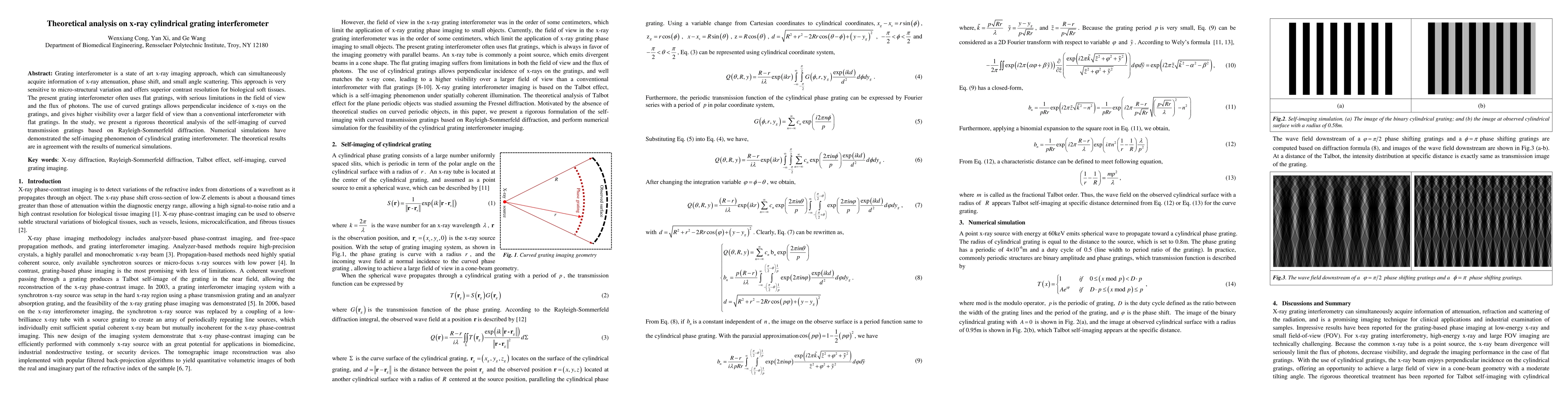 This paper presents a theoretical analysis of the x-ray cylindrical grating interferometer, demonstrating its enhanced visibility and larger field of view compared to flat gratings using Rayleigh-Sommerfeld diffraction. Numerical simulations confirm the self-imaging phenomenon, aligning with theoretical predictions.