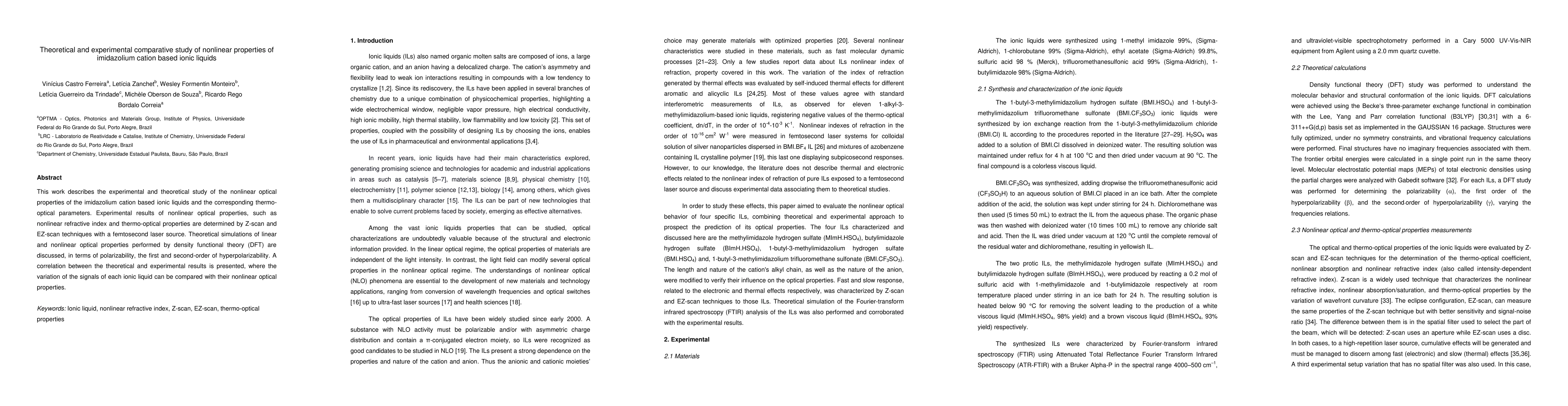 This paper investigates both experimentally and theoretically the nonlinear optical properties of imidazolium cation based ionic liquids, using Z-scan and EZ-scan techniques alongside density functional theory (DFT) simulations to analyze polarizability and hyperpolarizability. The study correlates theoretical predictions with experimental measurements to understand the thermo-optical behavior of these ionic liquids.