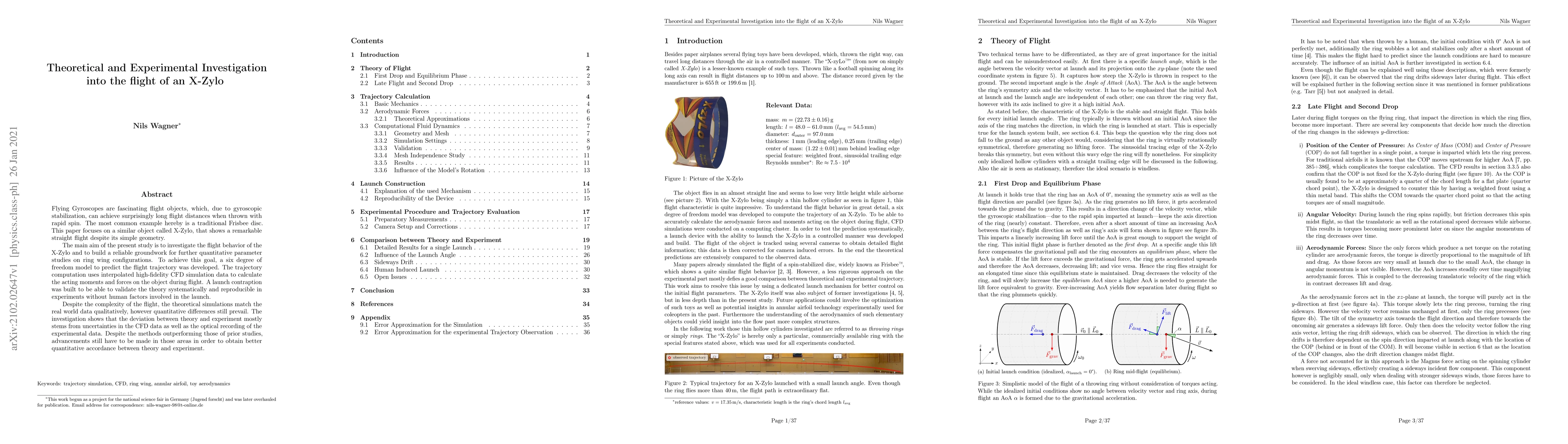Flying Gyroscopes are fascinating flight objects, which, due to gyroscopic stabilization, can achieve surprisingly long flight distances when thrown with rapid spin. The most common example hereby is a traditional Frisbee disc. This paper focuses on a similar object called X-Zylo, that shows a remarkable straight flight despite its simple geometry. The main aim of the present study is to investigate the flight behavior of the X-Zylo and to build a reliable groundwork for further quantitative parameter studies on ring wing configurations. To achieve this goal, a six degree of freedom model to predict the flight trajectory was developed. The trajectory computation uses interpolated high-fidelity CFD simulation data to calculate the acting moments and forces on the object during flight. A launch contraption was built to be able to validate the theory systematically and reproducible in experiments without human factors involved in the launch. Despite the complexity of the flight, the theoretical simulations match the real world data qualitatively, however quantitative differences still prevail. The investigation shows that the deviation between theory and experiment mostly stems from uncertainties in the CFD data as well as the optical recording of the experimental data. Despite the methods outperforming those of prior studies, advancements still have to be made in those areas in order to obtain better quantitative accordance between theory and experiment.