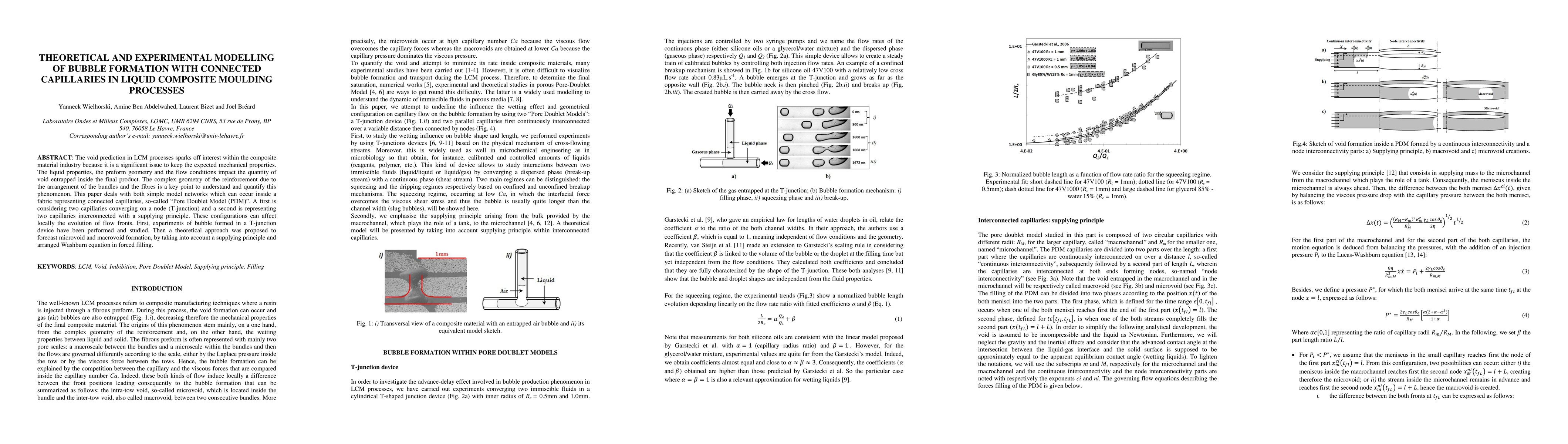 The void prediction in LCM processes sparks off interest within the composite material industry because it is a significant issue to keep the expected mechanical properties. The liquid properties, the preform geometry and the flow conditions impact the quantity of void entrapped inside the final product. The complex geometry of the reinforcement due to the arrangement of the bundles and the fibres is a key point to understand and quantify this phenomenon. This paper deals with both simple model networks which can occur inside a fabric representing connected capillaries, so-called "Pore Doublet Model (PDM)". A first is considering two capillaries converging on a node (T-junction) and a second is representing two capillaries interconnected with a supplying principle. These configurations can affect locally the evolution of flow fronts. First, experiments of bubble formed in a T-junction device have been performed and studied. Then a theoretical approach was proposed to forecast microvoid and macrovoid formation, by taking into account a supplying principle and arranged Washburn equation in forced filling.