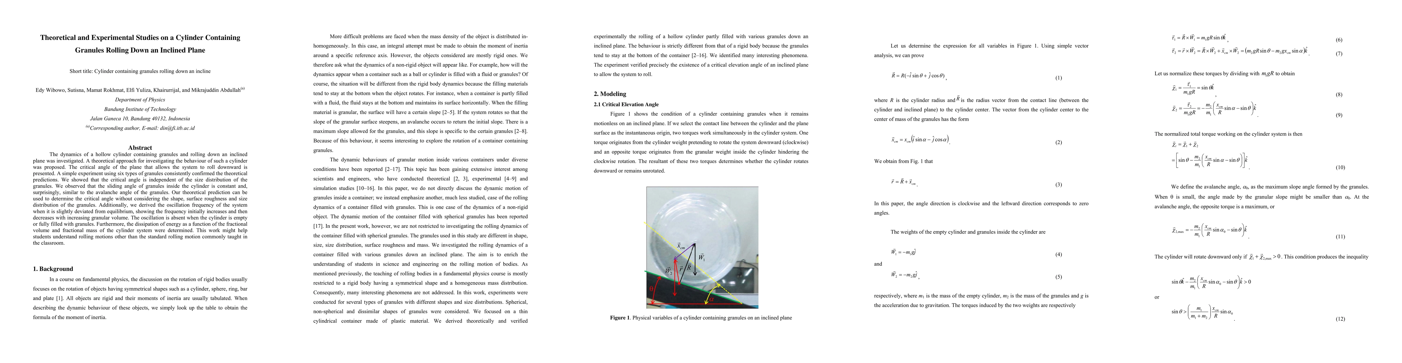 This paper investigates the dynamics of a cylinder filled with granules rolling down an inclined plane, proposing both theoretical and experimental methods to determine the critical angle for rolling. The study confirms that the critical angle is independent of granule size distribution and provides insights into the oscillation frequency and energy dissipation in the system.