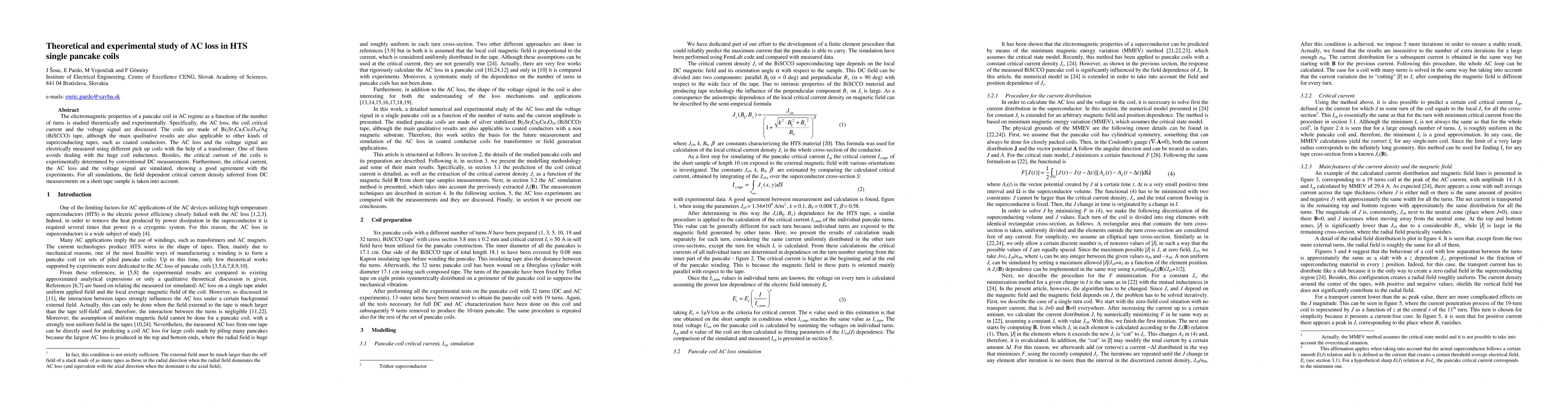 This paper investigates both theoretically and experimentally the AC loss in HTS single pancake coils, focusing on electromagnetic properties, coil critical current, and voltage signal. The study uses Bi2Sr2Ca2Cu3O10/Ag tape and demonstrates good agreement between experimental measurements and simulations.