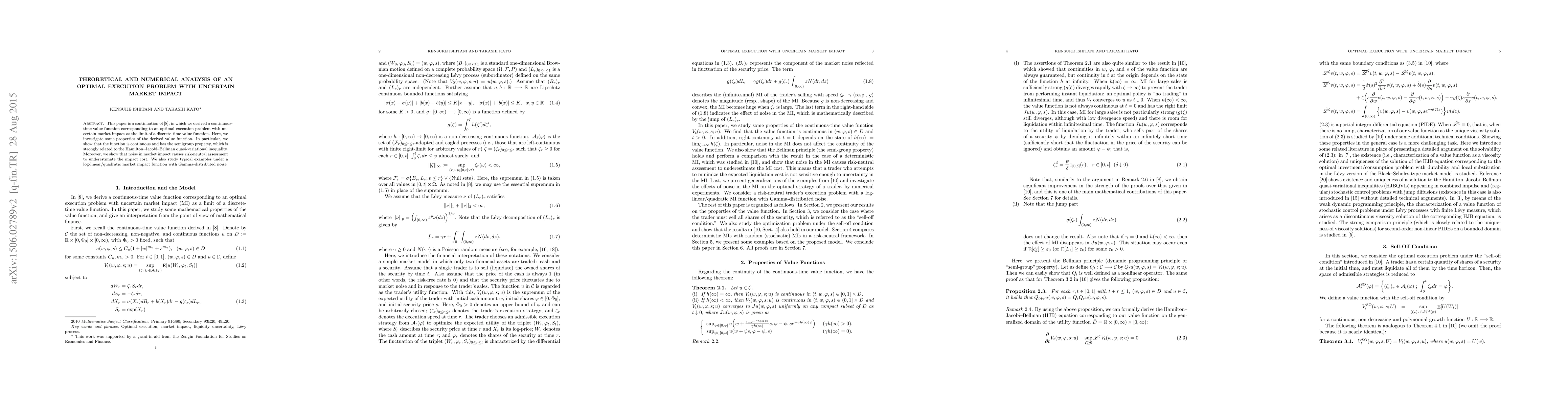 This paper extends previous work on optimal execution problems, deriving a continuous-time value function and analyzing its properties. It demonstrates continuity and semigroup properties, and highlights that market impact noise leads to underestimation of cost in risk-neutral assessments.