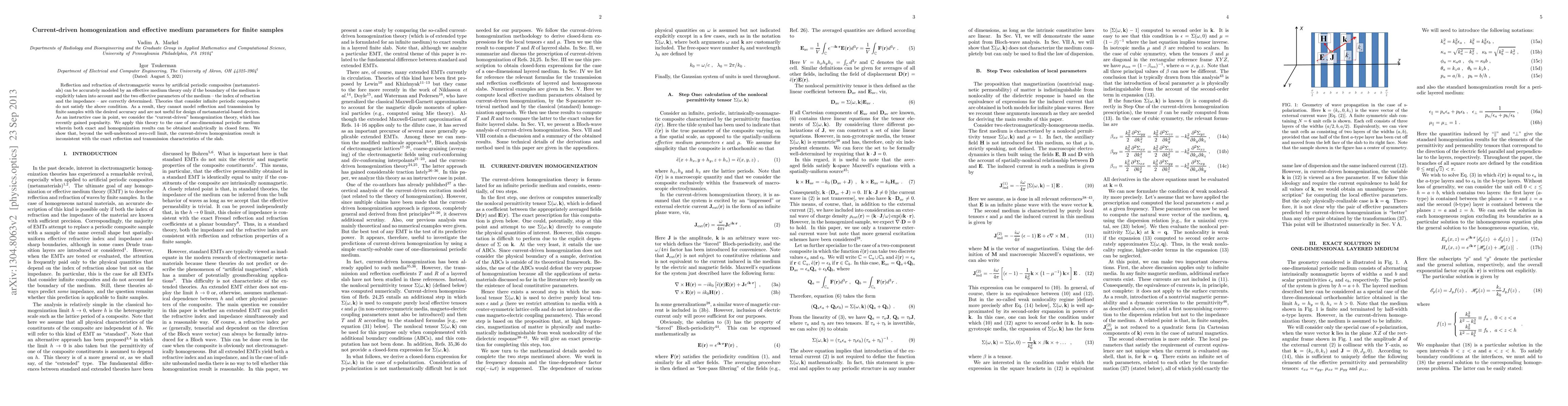 Reflection and refraction of electromagnetic waves by artificial periodic composites (metamaterials) can be accurately modeled by an effective medium theory only if the boundary of the medium is explicitly taken into account and the two effective parameters of the medium -- the index of refraction and the impedance -- are correctly determined. Theories that consider infinite periodic composites do not satisfy the above condition. As a result, they cannot model reflection and transmission by finite samples with the desired accuracy and are not useful for design of metamaterial-based devices. As an instructive case in point, we consider the "current-driven" homogenization theory, which has recently gained popularity. We apply this theory to the case of one-dimensional periodic medium wherein both exact and homogenization results can be obtained analytically in closed form. We show that, beyond the well-understood zero-cell limit, the current-driven homogenization result is inconsistent with the exact reflection and transmission characteristics of the slab.