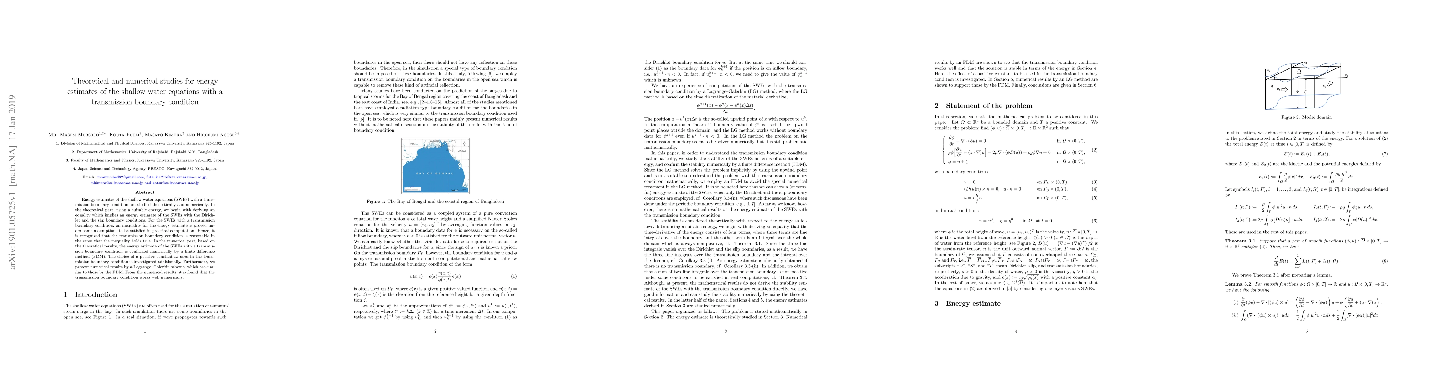 Energy estimates of the shallow water equations (SWEs) with a transmission boundary condition are studied theoretically and numerically. In the theoretical part, using a suitable energy, we begin with deriving an equality which implies an energy estimate of the SWEs with the Dirichlet and the slip boundary conditions. For the SWEs with a transmission boundary condition, an inequality for the energy estimate is proved under some assumptions to be satisfied in practical computation. Hence, it is recognized that the transmission boundary condition is reasonable in the sense that the inequality holds true. In the numerical part, based on the theoretical results, the energy estimate of the SWEs with a transmission boundary condition is confirmed numerically by a finite difference method (FDM). The choice of a positive constant c0 used in the transmission boundary condition is investigated additionally. Furthermore, we present numerical results by a Lagrange-Galerkin scheme, which are similar to those by the FDM. From the numerical results, it is found that the transmission boundary condition works well numerically.