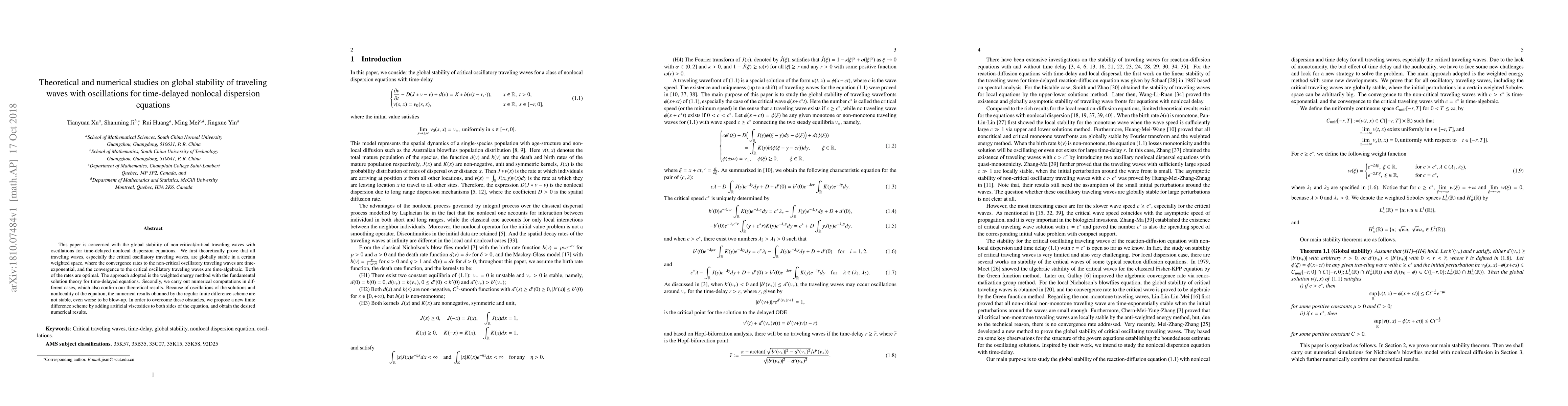 This paper investigates the global stability of oscillatory traveling waves in time-delayed nonlocal dispersion equations, proving their stability through the weighted energy method and confirming results numerically using a newly proposed finite difference scheme with artificial viscosities to handle solution oscillations and nonlocality.