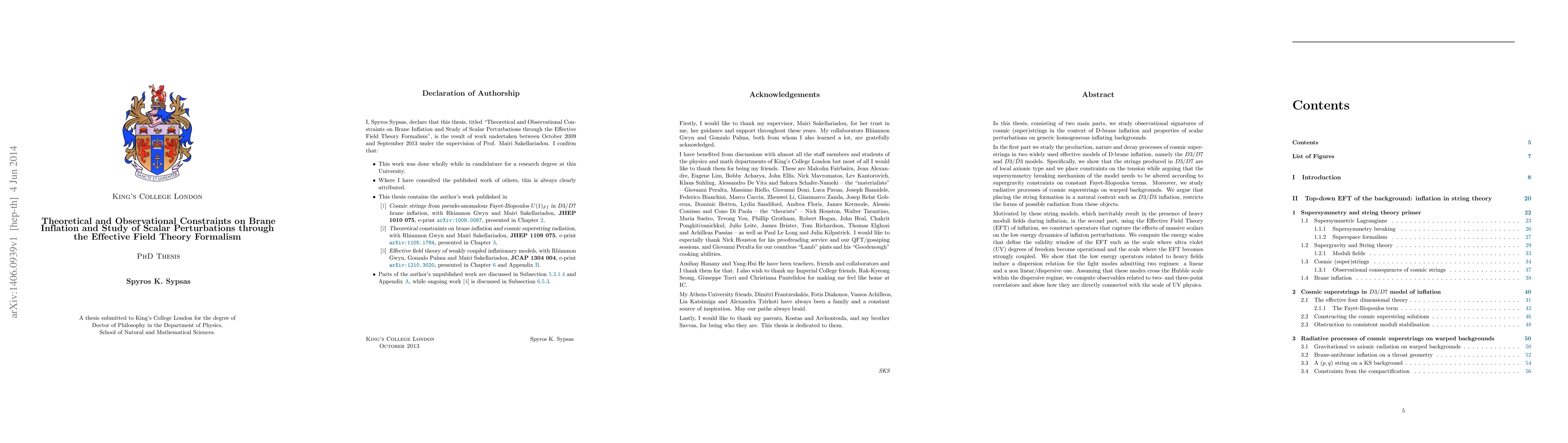 In this thesis, consisting of two main parts, we study observational signatures of cosmic (super)strings in the context of D-brane inflation and properties of scalar perturbations on generic homogeneous inflating backgrounds. In the first part we study the production, nature and decay processes of cosmic superstrings in two widely used effective models of D-brane inflation, namely the $D3/D7$ and $D3/\bar{D}3$ models. Specifically, we show that the strings produced in $D3/D7$ are of local axionic type and we place constraints on the tension while arguing that the supersymmetry breaking mechanism of the model needs to be altered according to supergravity constraints on constant Fayet-Iliopoulos terms. Moreover, we study radiative processes of cosmic superstrings on warped backgrounds. We argue that placing the string formation in a natural context such as $D3/\bar{D}3$ inflation, restricts the forms of possible radiation from these objects. Motivated by these string models, which inevitably result in the presence of heavy moduli fields during inflation, in the second part, using the Effective Field Theory (EFT) of inflation, we construct operators that capture the effects of massive scalars on the low energy dynamics of inflaton perturbations. We compute the energy scales that define the validity window of the EFT such as the scale where ultra violet (UV) degrees of freedom become operational and the scale where the EFT becomes strongly coupled. We show that the low energy operators related to heavy fields induce a dispersion relation for the light modes admitting two regimes: a linear and a non linear/dispersive one. Assuming that these modes cross the Hubble scale within the dispersive regime, we compute observables related to two- and three-point correlators and show how they are directly connected with the scale of UV physics.