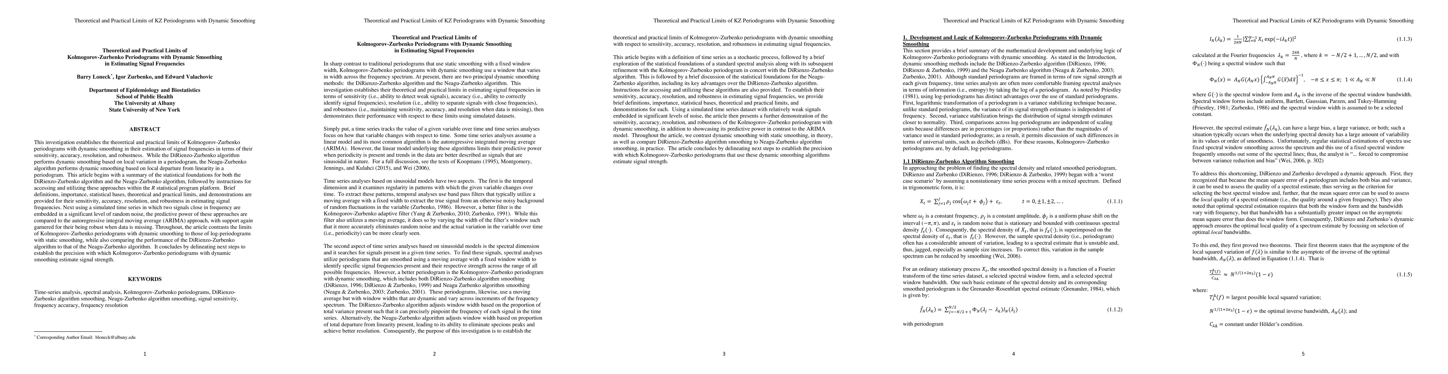 This paper explores the theoretical and practical limits of the Kolmogorov-Zurbenko periodogram with DiRienzo-Zurbenko algorithm smoothing for spectral analysis, demonstrating its superiority over ARIMA methods and its robustness against missing data. The study concludes with examples of its application across various scientific fields.