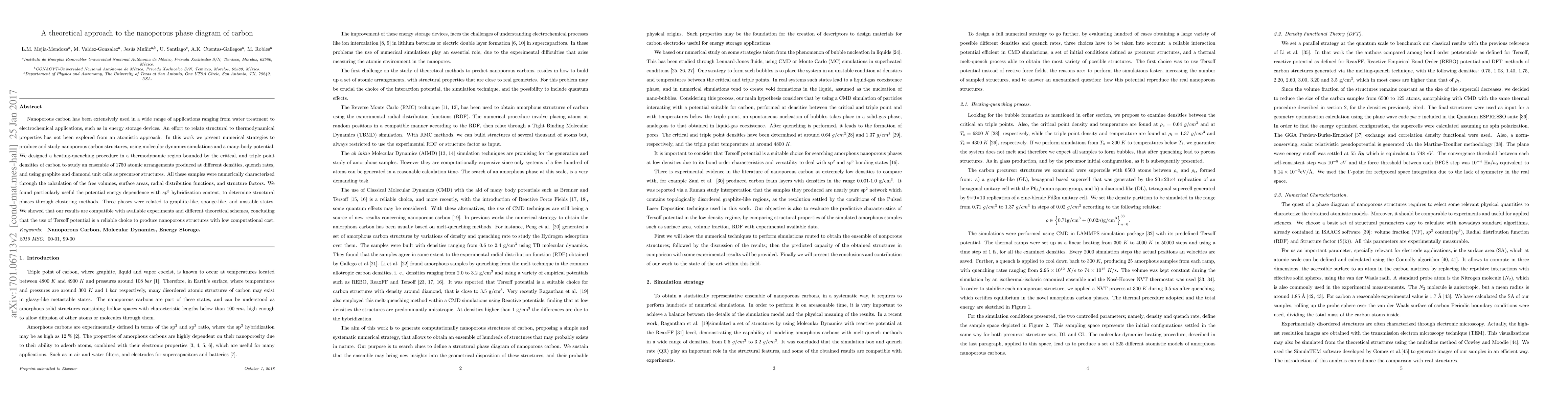 Nanoporous carbon has been extensively used in a wide range of applications ranging from water treatment to electrochemical applications, such as in energy storage devices. An effort to relate structural to thermodynamical properties has not been explored from an atomistic approach. In this work we present numerical strategies to produce and study nanoporous carbon structures, using molecular dynamics simulations and a many-body potential. We designed a heating-quenching procedure in a thermodynamic region bounded by the critical, and triple point densities of carbon to study an ensemble of 1750 atomic arrangements produced at different densities, quench rates, and using graphite and diamond unit cells as precursor structures. All these samples were numerically characterized through the calculation of the free volumes, surface areas, radial distribution functions, and structure factors. We found particularly useful the potential energy dependence with $sp^3$ hybridization content, to determine structural phases through clustering methods. Three phases were related to graphite-like, sponge-like, and unstable states. We showed that our results are compatible with available experiments and different theoretical schemes, concluding that the use of Tersoff potential is a reliable choice to produce nanoporous structures with low computational cost.