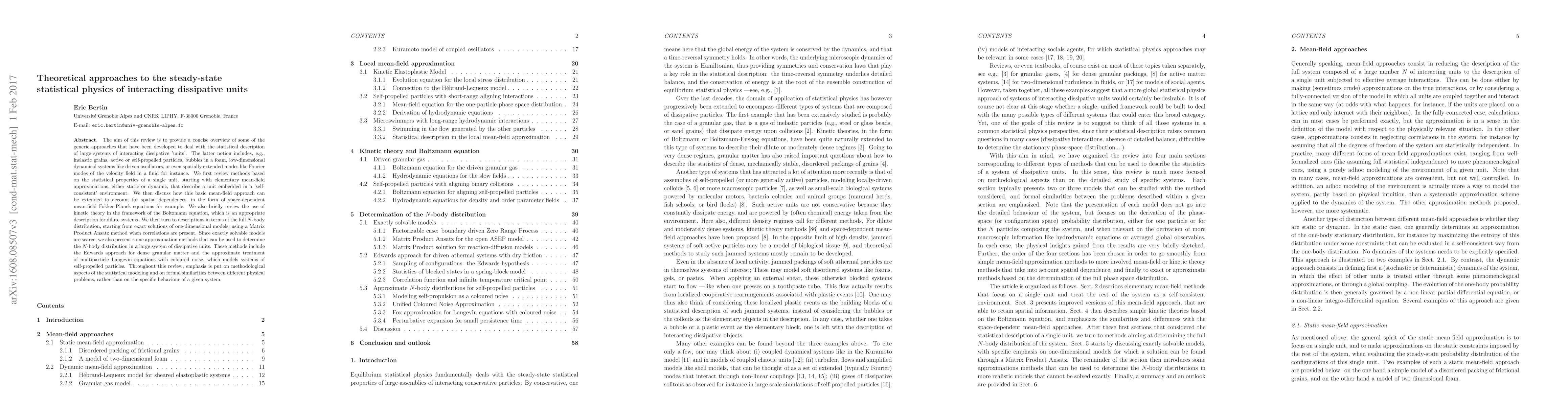 This review paper discusses various theoretical approaches to modeling large systems of interacting dissipative units, including methods for describing single units, spatial dependences, and full N-body distributions, with a focus on methodological aspects and formal similarities between physical problems.