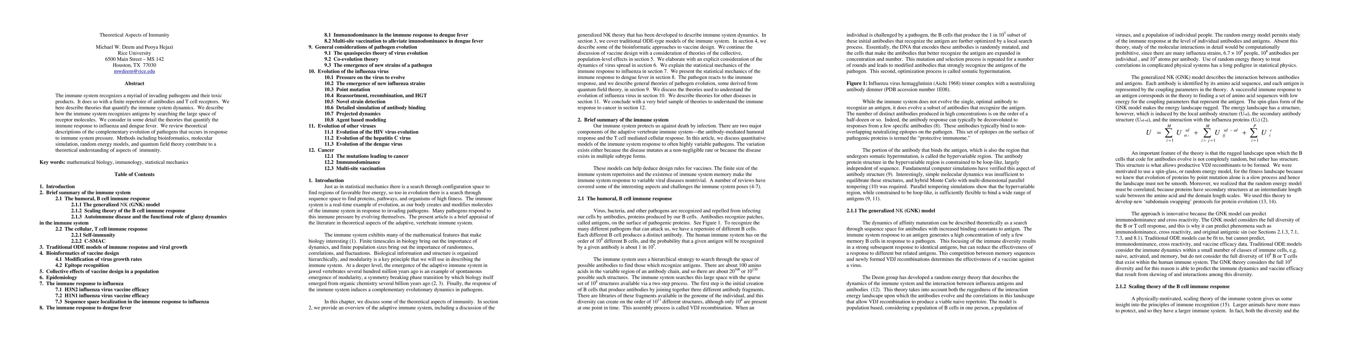 The immune system recognizes a myriad of invading pathogens and their toxic products. It does so with a finite repertoire of antibodies and T cell receptors. We here describe theories that quantify the immune system dynamics. We describe how the immune system recognizes antigens by searching the large space of receptor molecules. We consider in some detail the theories that quantify the immune response to influenza and dengue fever. We review theoretical descriptions of the complementary evolution of pathogens that occurs in response to immune system pressure. Methods including bioinformatics, molecular simulation, random energy models, and quantum field theory contribute to a theoretical understanding of aspects of immunity.