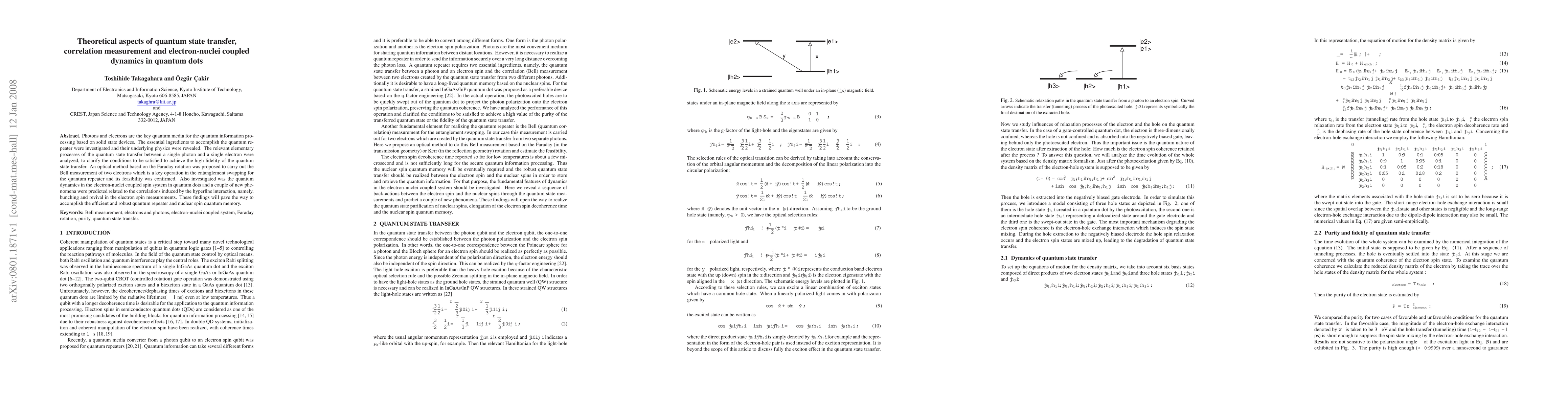This paper explores the theoretical underpinnings of quantum state transfer and correlation measurement in quantum dots, proposing an optical method for Bell measurement and predicting new phenomena in electron-nuclei coupled dynamics, which are crucial for developing efficient quantum repeaters and nuclear spin quantum memory.