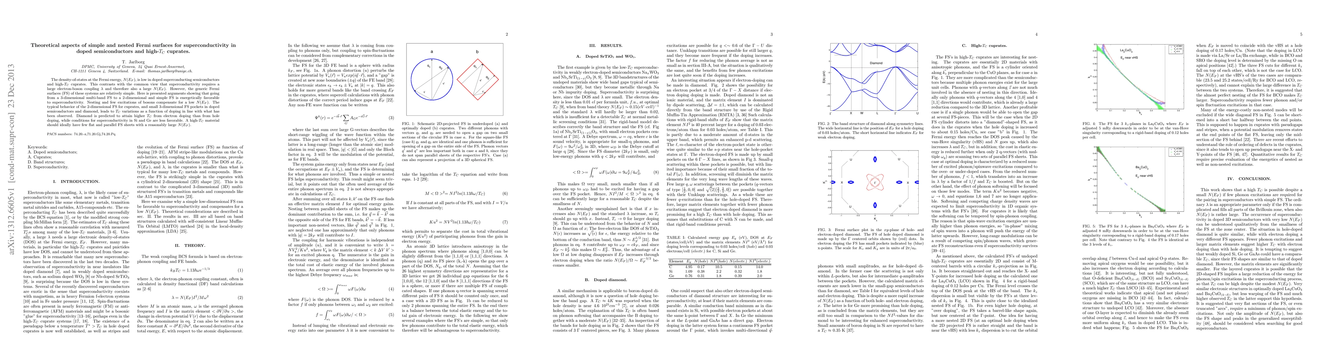 This paper argues that superconductivity in doped semiconductors and high-$T_C$ cuprates can occur despite low density-of-states at the Fermi energy, due to energetically favorable simple and nested Fermi surfaces that compensate for this low density. The theoretical framework predicts variations in critical temperature $T_C$ based on doping and material structure.