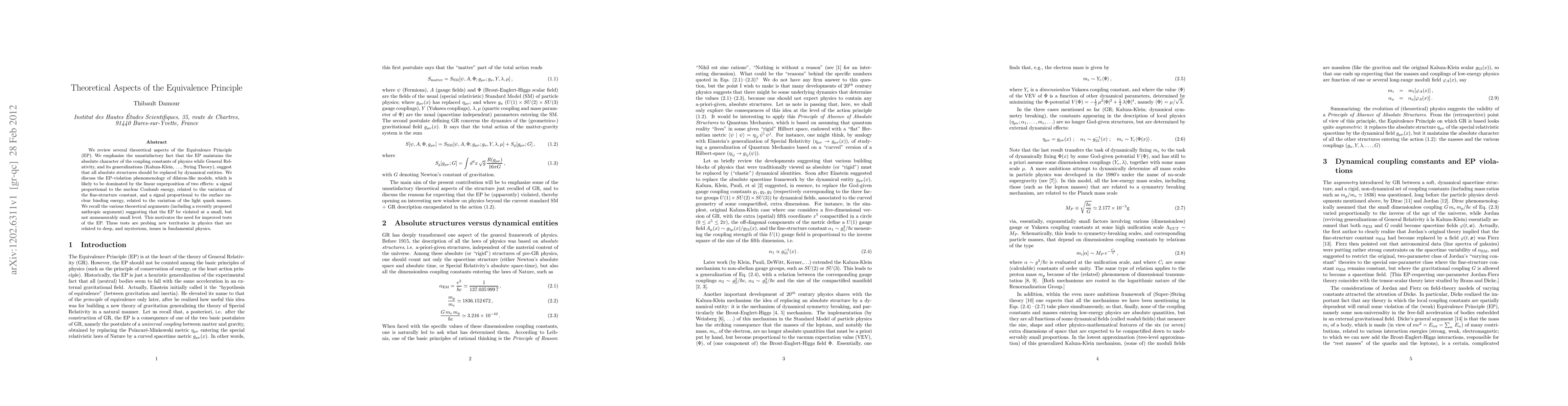 We review several theoretical aspects of the Equivalence Principle (EP). We emphasize the unsatisfactory fact that the EP maintains the absolute character of the coupling constants of physics while General Relativity, and its generalizations (Kaluza-Klein,..., String Theory), suggest that all absolute structures should be replaced by dynamical entities. We discuss the EP-violation phenomenology of dilaton-like models, which is likely to be dominated by the linear superposition of two effects: a signal proportional to the nuclear Coulomb energy, related to the variation of the fine-structure constant, and a signal proportional to the surface nuclear binding energy, related to the variation of the light quark masses. We recall the various theoretical arguments (including a recently proposed anthropic argument) suggesting that the EP be violated at a small, but not unmeasurably small level. This motivates the need for improved tests of the EP. These tests are probing new territories in physics that are related to deep, and mysterious, issues in fundamental physics.