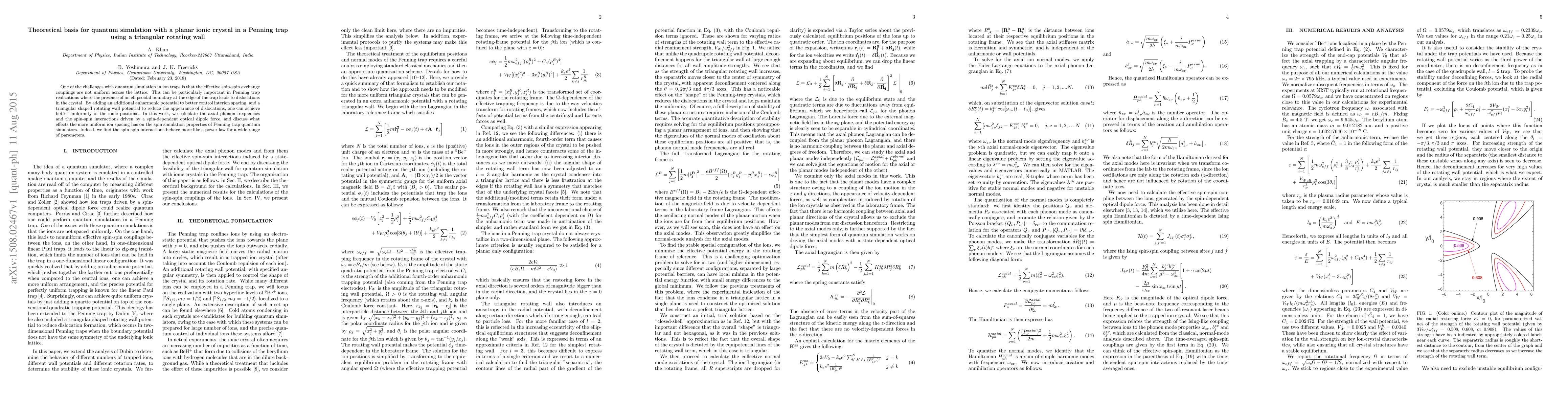This paper explores a theoretical framework for quantum simulation using a planar ionic crystal in a Penning trap, addressing non-uniform spin-spin exchange couplings by introducing an anharmonic potential and a triangular rotating wall. The study calculates axial phonon frequencies and spin-spin interactions, finding improved uniformity in ion spacing enhances spin simulation properties.