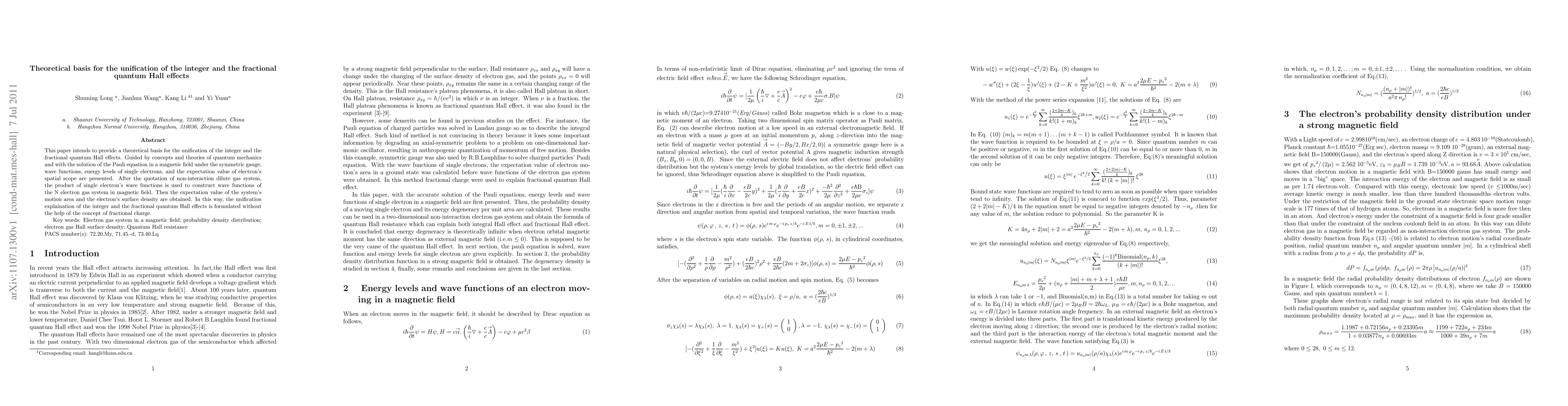 This paper presents a theoretical framework to unify the integer and fractional quantum Hall effects using quantum mechanics principles and the Pauli equation, establishing wave functions and energy levels for electrons in a magnetic field, and deriving the motion area and electron surface density without invoking fractional charge.
