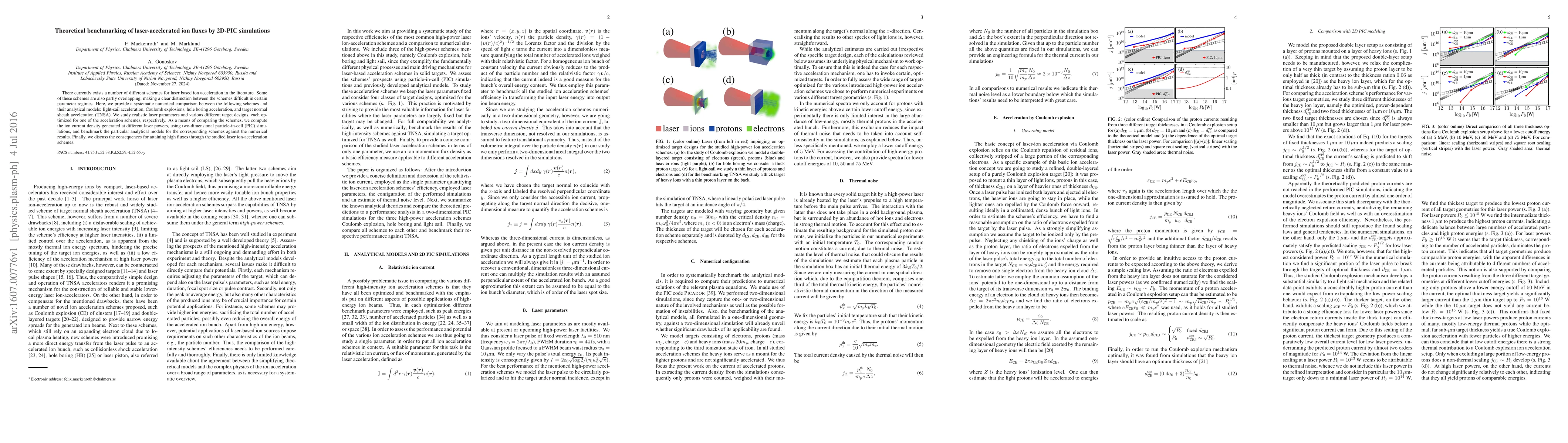 This paper systematically compares various laser-based ion acceleration schemes—light-sail, Coulomb explosions, hole boring, and TNSA—using 2D-PIC simulations. The study benchmarks analytical models against numerical results to determine ion current density and optimal target designs for high ion flux.