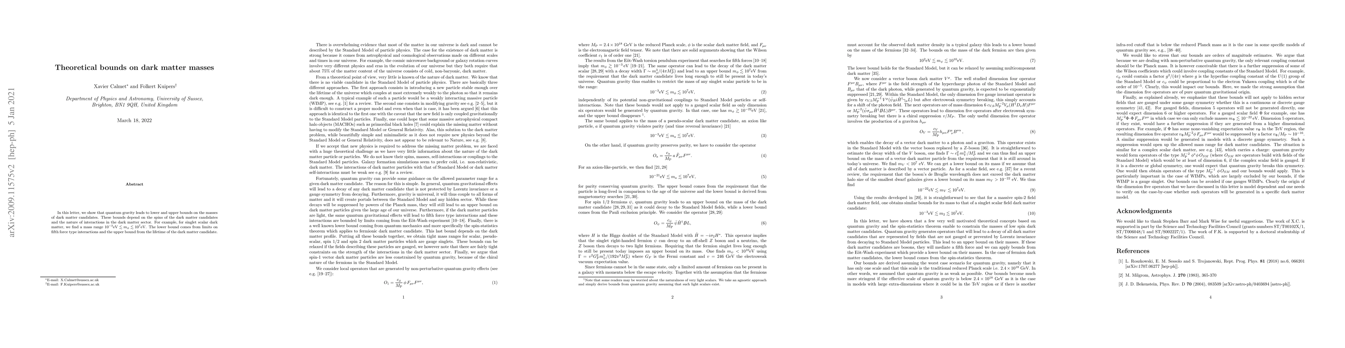 This paper establishes theoretical bounds on dark matter masses derived from quantum gravity, showing that these bounds depend on the dark matter's spin and interactions. For singlet scalar dark matter, the mass range is found to be $10^{-3}{\rm eV} \lesssim m_\phi \lesssim 10^{7}{\rm eV}$, with the lower bound arising from fifth force limits and the upper bound from the dark matter's lifetime.