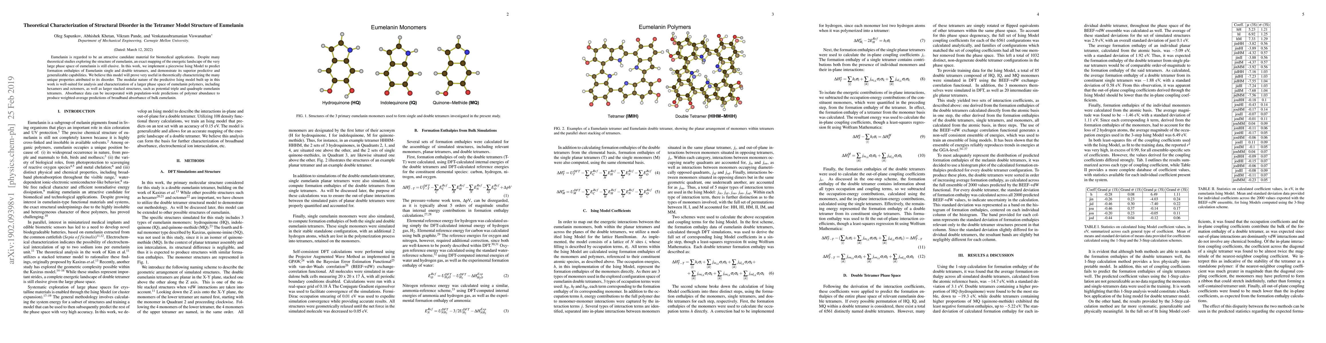 Eumelanin is regarded to be an attractive candidate material for biomedical applications. Despite many theoretical studies exploring the structure of eumelanin, an exact mapping of the energetic landscape of the very large phase space of eumelanin is still elusive. In this work, we implement a piecewise Ising Model to predict formation enthalpies of Eumelanin single and double tetramers, and demonstrate its superior predictive and generalizable capabilities. We believe this model will prove very useful in theoretically characterizing the many unique properties attributed to its disorder. The modular nature of the predictive Ising model built up in this work is well-suited for analysis and characterization of a larger phase space of eumelanin polymers, including hexamers and octomers, as well as larger stacked structures, such as potential triple and quadruple eumelanin tetramers. Absorbance data can be incorporated with population-wide predictions of polymer abundance to produce weighted-average predictions of broadband absorbance of bulk eumelanin.