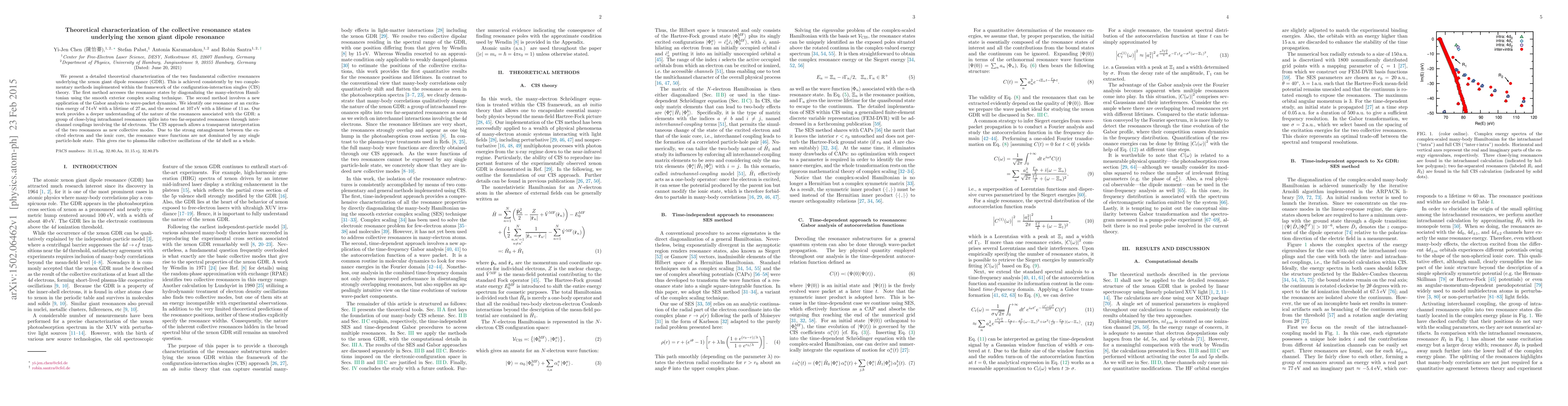 We present a detailed theoretical characterization of the two fundamental collective resonances underlying the xenon giant dipole resonance (GDR). This is achieved consistently by two complementary methods implemented within the framework of the configuration-interaction singles (CIS) theory. The first method accesses the resonance states by diagonalizing the many-electron Hamiltonian using the smooth exterior complex scaling technique. The second method involves a new application of the Gabor analysis to wave-packet dynamics. We identify one resonance at an excitation energy of 74 eV with a lifetime of 27 as, and the second at 107 eV with a lifetime of 11 as. Our work provides a deeper understanding of the nature of the resonances associated with the GDR: a group of close-lying intrachannel resonances splits into two far-separated resonances through interchannel couplings involving the 4d electrons. The CIS approach allows a transparent interpretation of the two resonances as new collective modes. Due to the strong entanglement between the excited electron and the ionic core, the resonance wave functions are not dominated by any single particle-hole state. This gives rise to plasma-like collective oscillations of the 4d shell as a whole.