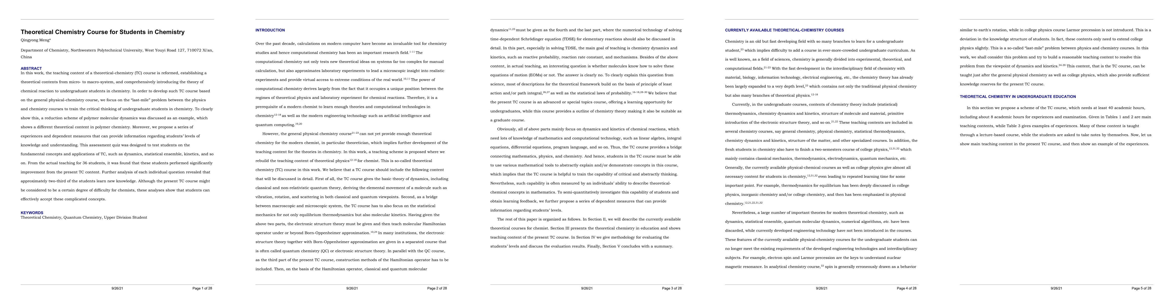 This paper details a reformed theoretical chemistry course aimed at bridging the gap between physics and chemistry for undergraduate students, focusing on critical thinking and comprehensive understanding of chemical reaction theory. The course showed significant improvement in students' grasp of theoretical concepts, with two-thirds of students effectively absorbing new knowledge despite the course's complexity.