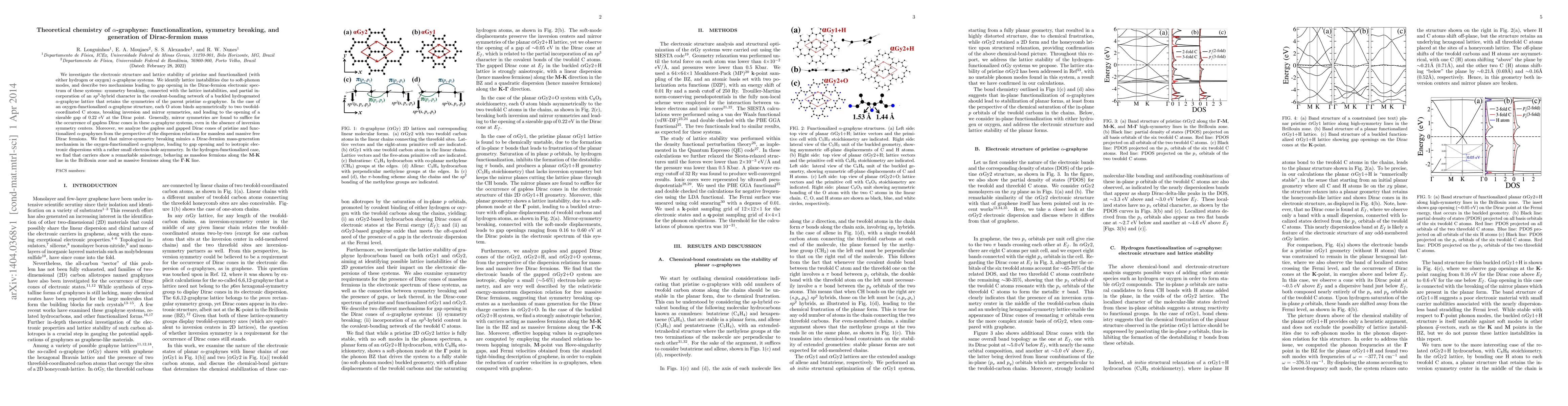 This paper explores the electronic structure and lattice stability of $\alpha$-graphyne, both pristine and functionalized with hydrogen or oxygen. It identifies lattice instabilities and describes mechanisms for gap opening in the Dirac-fermion spectrum, including symmetry breaking and $sp^3$-hybrid character incorporation. Oxygen functionalization leads to a sizeable gap due to symmetry breaking, while hydrogen functionalization results in anisotropic carrier behavior.