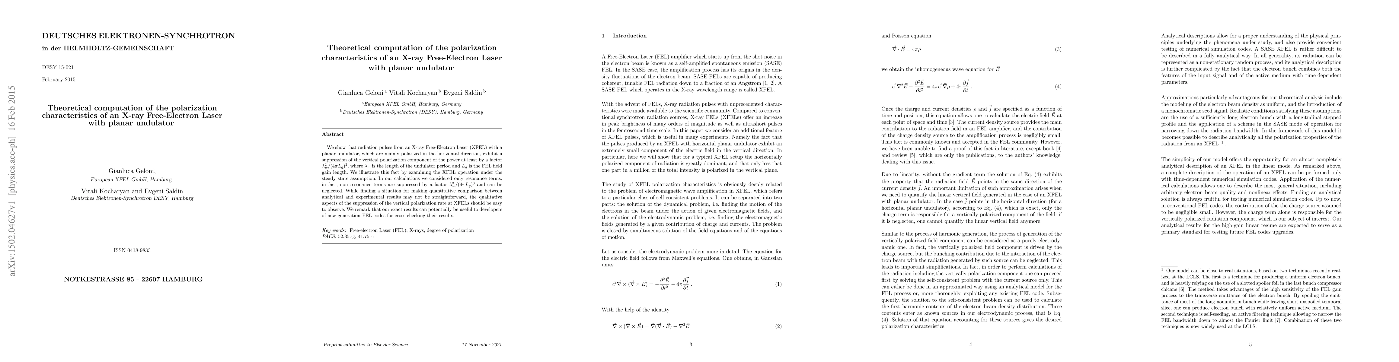 This paper theoretically computes the polarization characteristics of an X-ray Free-Electron Laser (XFEL) with a planar undulator, showing that it suppresses the vertical polarization component by a factor of $\lambda_w^2/(4 \pi L_g)^2$. The study highlights the potential utility of these findings for developers of new FEL codes.