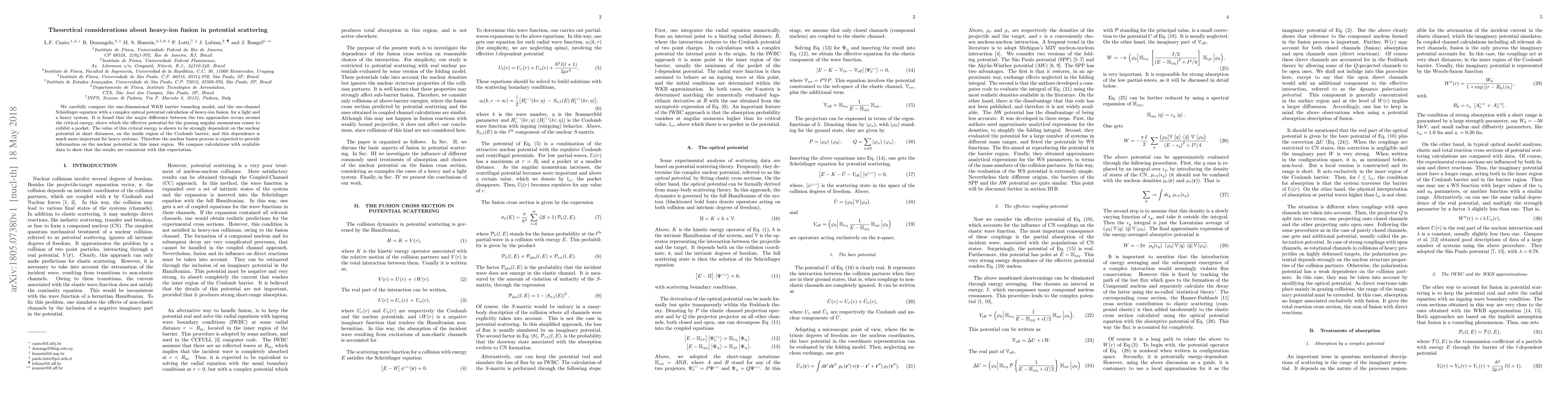 We carefully compare the one-dimensional WKB barrier tunneling model, and the one-channel Sch\"odinger equation with a complex optical potential calculation of heavy-ion fusion, for a light and a heavy system. It is found that the major difference between the two approaches occurs around the critical energy, above which the effective potential for the grazing angular momentum ceases to exhibit a pocket. The value of this critical energy is shown to be strongly dependent on the nuclear potential at short distances, on the inside region of the Coulomb barrier, and this dependence is much more important for heavy systems. Therefore the nuclear fusion process is expected to provide information on the nuclear potential in this inner region. We compare calculations with available data to show that the results are consistent with this expectation.