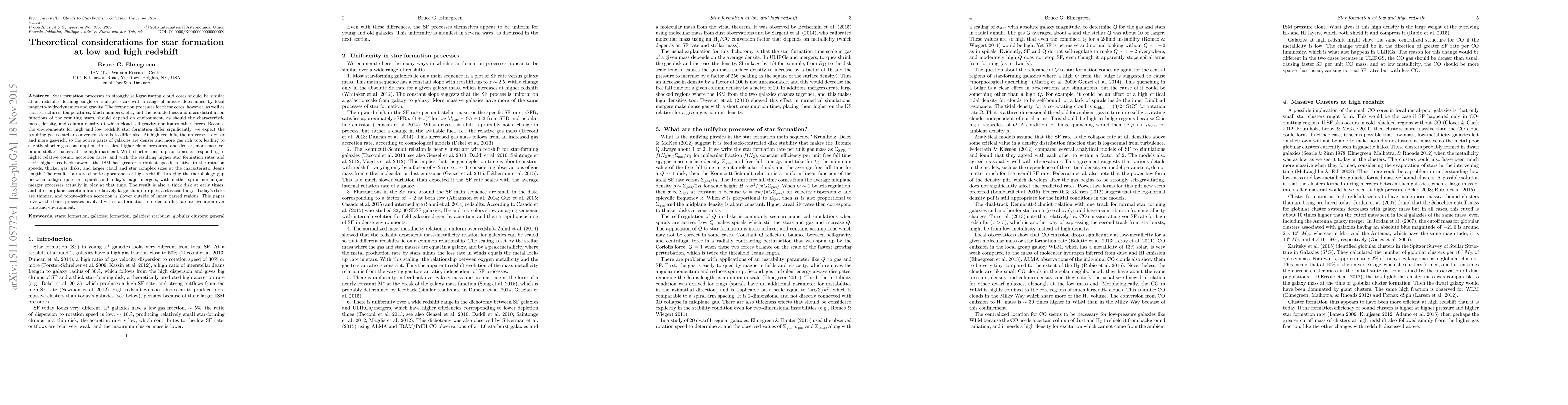 Star formation in strongly self-gravitating cloud cores should be similar at all redshifts, forming single or multiple stars with a range of masses determined by local magneto-hydrodynamics and gravity. The formation processes for these cores, however, as well as their structures, temperatures, Mach numbers, etc., and the boundedness and mass distribution functions of the resulting stars, should depend on environment, as should the characteristic mass, density, and column density at which cloud self-gravity dominates other forces. Because the environments for high and low redshift star formation differ significantly, we expect the resulting gas to stellar conversion details to differ also. At high redshift, the universe is denser and more gas-rich, so the active parts of galaxies are denser and more gas rich too, leading to slightly shorter gas consumption timescales, higher cloud pressures, and denser, more massive, bound stellar clusters at the high mass end. With shorter consumption times corresponding to higher relative cosmic accretion rates, and with the resulting higher star formation rates and their higher feedback powers, the ISM has greater turbulent speeds relative to the rotation speeds, thicker gas disks, and larger cloud and star complex sizes at the characteristic Jeans length. The result is a more chaotic appearance at high redshift, bridging the morphology gap between today's quiescent spirals and today's major-mergers, with neither spiral nor major-merger processes actually in play at that time. The result is also a thick disk at early times, and after in-plane accretion from relatively large clump torques, a classical bulge. Today's disks are thinner, and torque-driven accretion is slower outside of inner barred regions. This paper reviews the basic processes involved with star formation in order to illustrate its evolution over time and environment.
