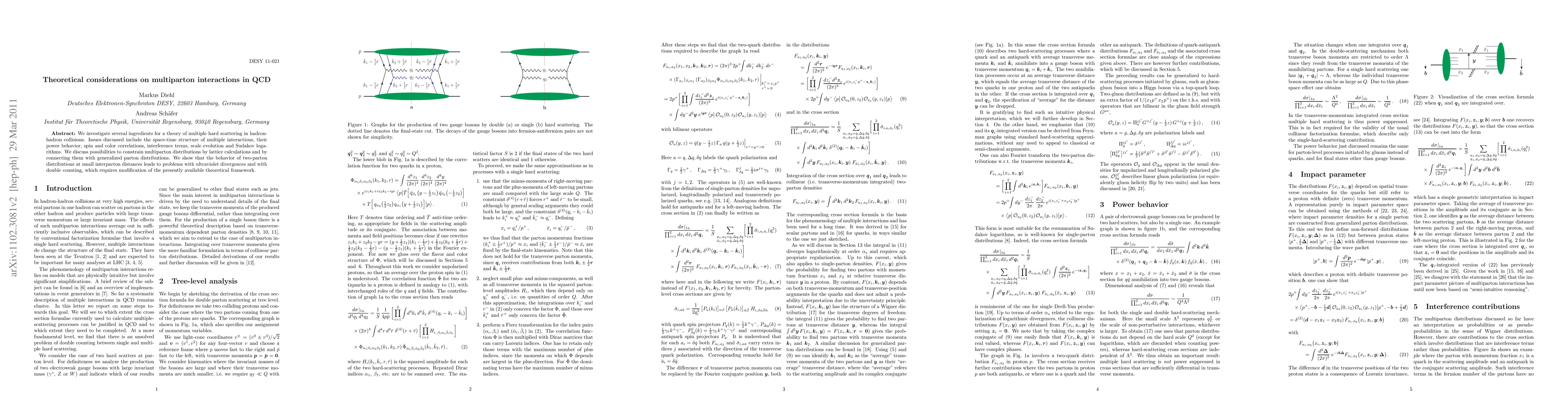 We investigate several ingredients for a theory of multiple hard scattering in hadron-hadron collisions. Issues discussed include the space-time structure of multiple interactions, their power behavior, spin and color correlations, interference terms, scale evolution and Sudakov logarithms. We discuss possibilities to constrain multiparton distributions by lattice calculations and by connecting them with generalized parton distributions. We show that the behavior of two-parton distributions at small interparton distances leads to problems with ultraviolet divergences and with double counting, which requires modification of the presently available theoretical framework.