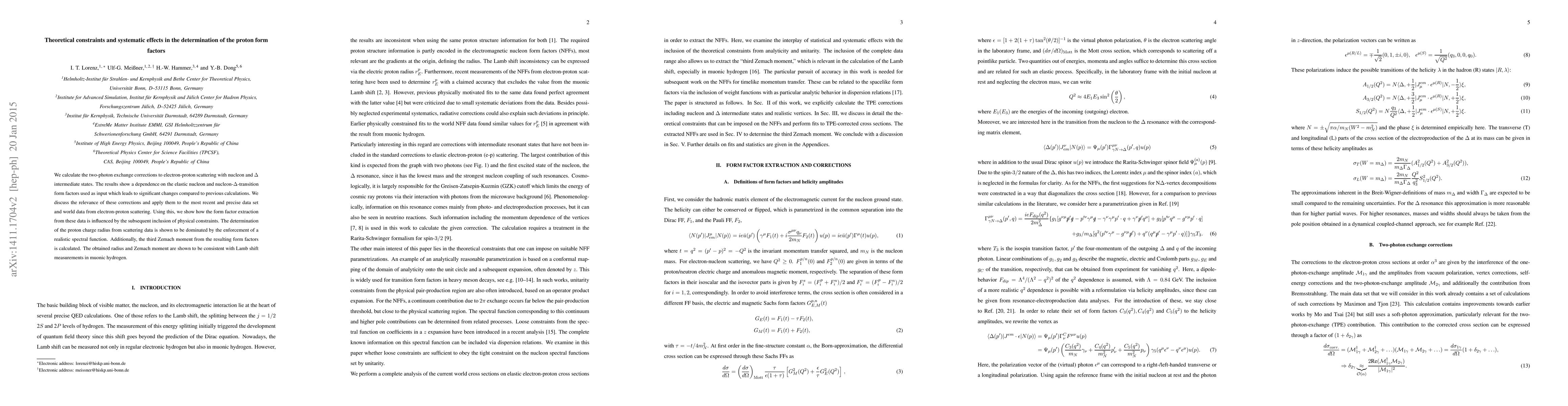 We calculate the two-photon exchange corrections to electron-proton scattering with nucleon and $\Delta$ intermediate states. The results show a dependence on the elastic nucleon and nucleon-$\Delta$-transition form factors used as input which leads to significant changes compared to previous calculations. We discuss the relevance of these corrections and apply them to the most recent and precise data set and world data from electron-proton scattering. Using this, we show how the form factor extraction from these data is influenced by the subsequent inclusion of physical constraints. The determination of the proton charge radius from scattering data is shown to be dominated by the enforcement of a realistic spectral function. Additionally, the third Zemach moment from the resulting form factors is calculated. The obtained radius and Zemach moment are shown to be consistent with Lamb shift measurements in muonic hydrogen.