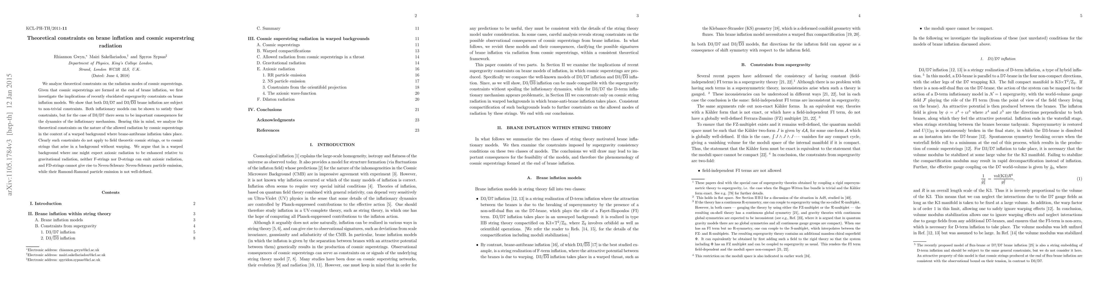 This paper examines theoretical constraints on brane inflation models, specifically D3/D7 and D3/anti-D3, and the subsequent radiation from cosmic superstrings. It finds that while both models can satisfy supergravity constraints, D3/D7 may impact the inflationary mechanism. Additionally, it concludes that cosmic superstrings cannot emit axionic radiation, and FD-strings cannot produce certain particle emissions.