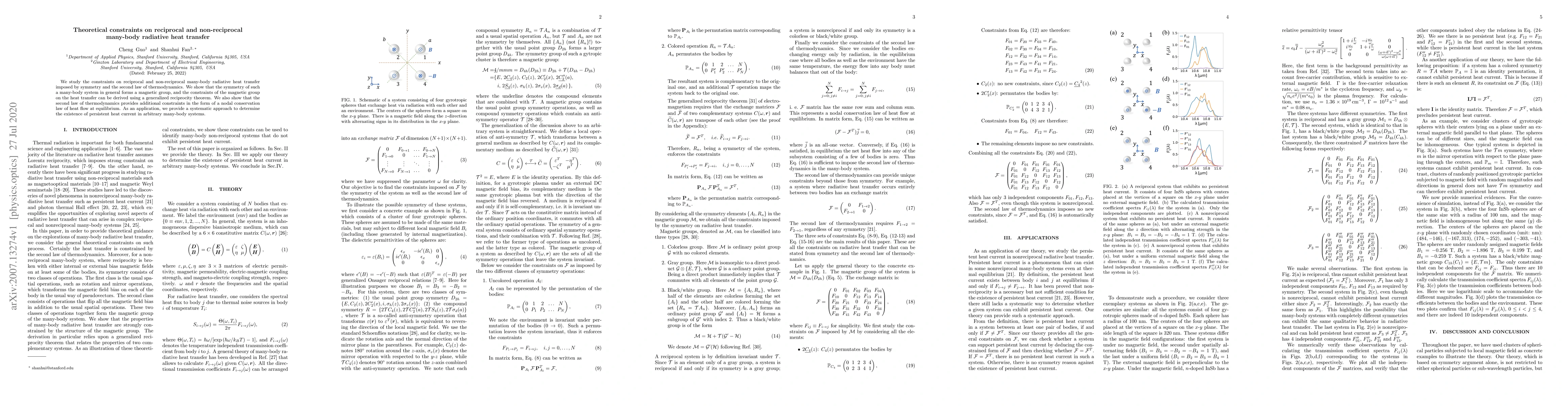 We study the constraints on reciprocal and non-reciprocal many-body radiative heat transfer imposed by symmetry and the second law of thermodynamics. We show that the symmetry of such a many-body system in general forms a magnetic group, and the constraints of the magnetic group on the heat transfer can be derived using a generalized reciprocity theorem. We also show that the second law of thermodynamics provides additional constraints in the form of a nodal conservation law of heat flow at equilibrium. As an application, we provide a systematic approach to determine the existence of persistent heat current in arbitrary many-body systems.